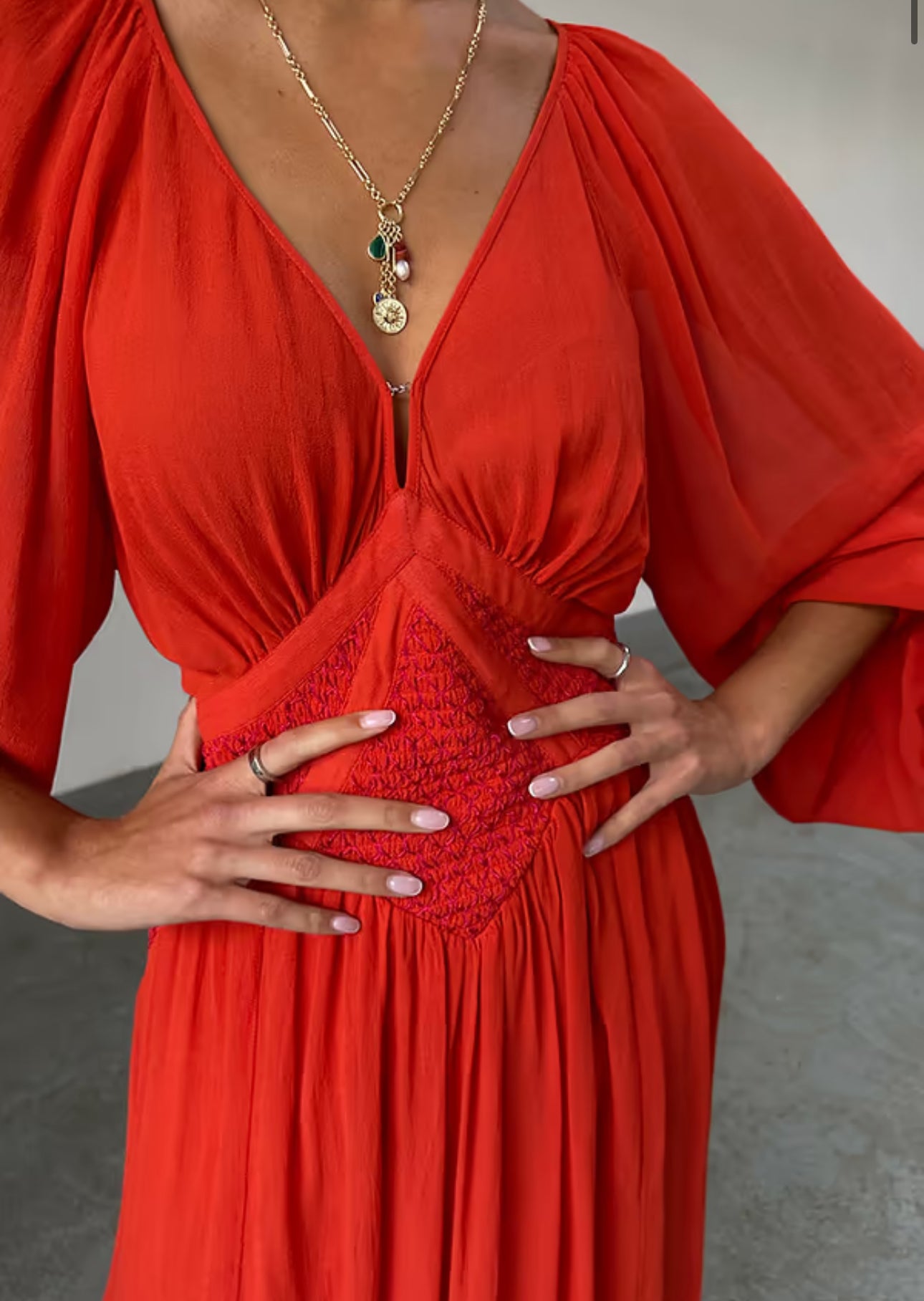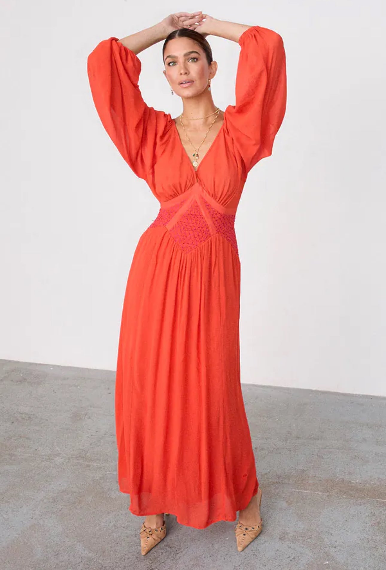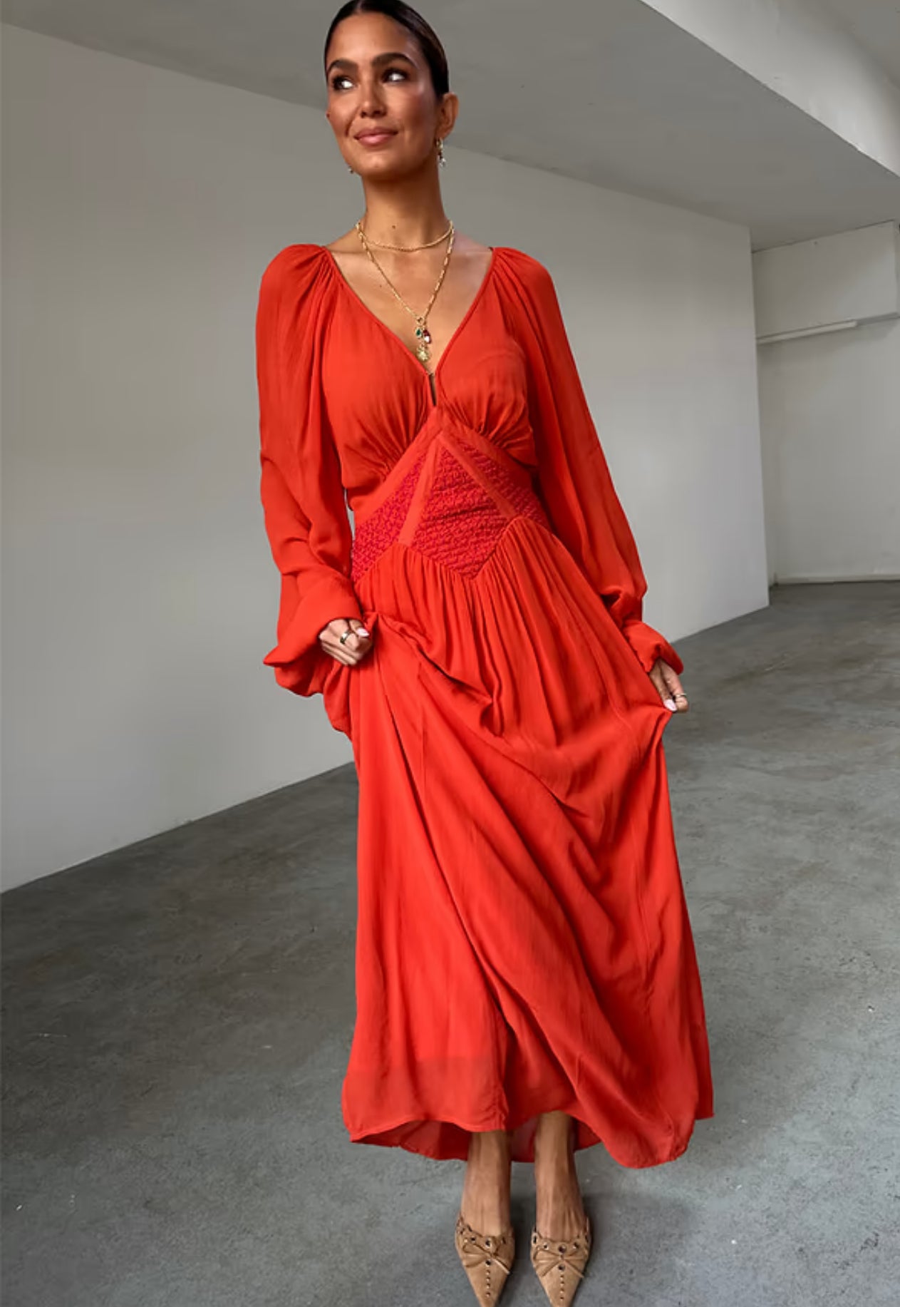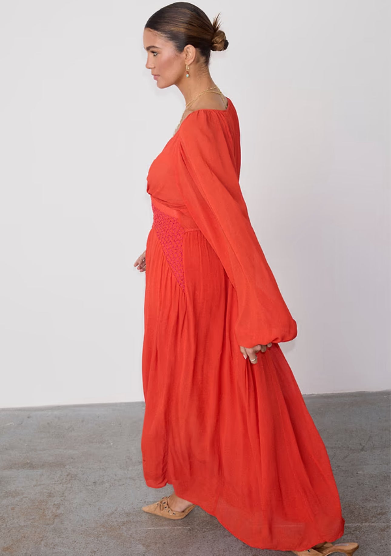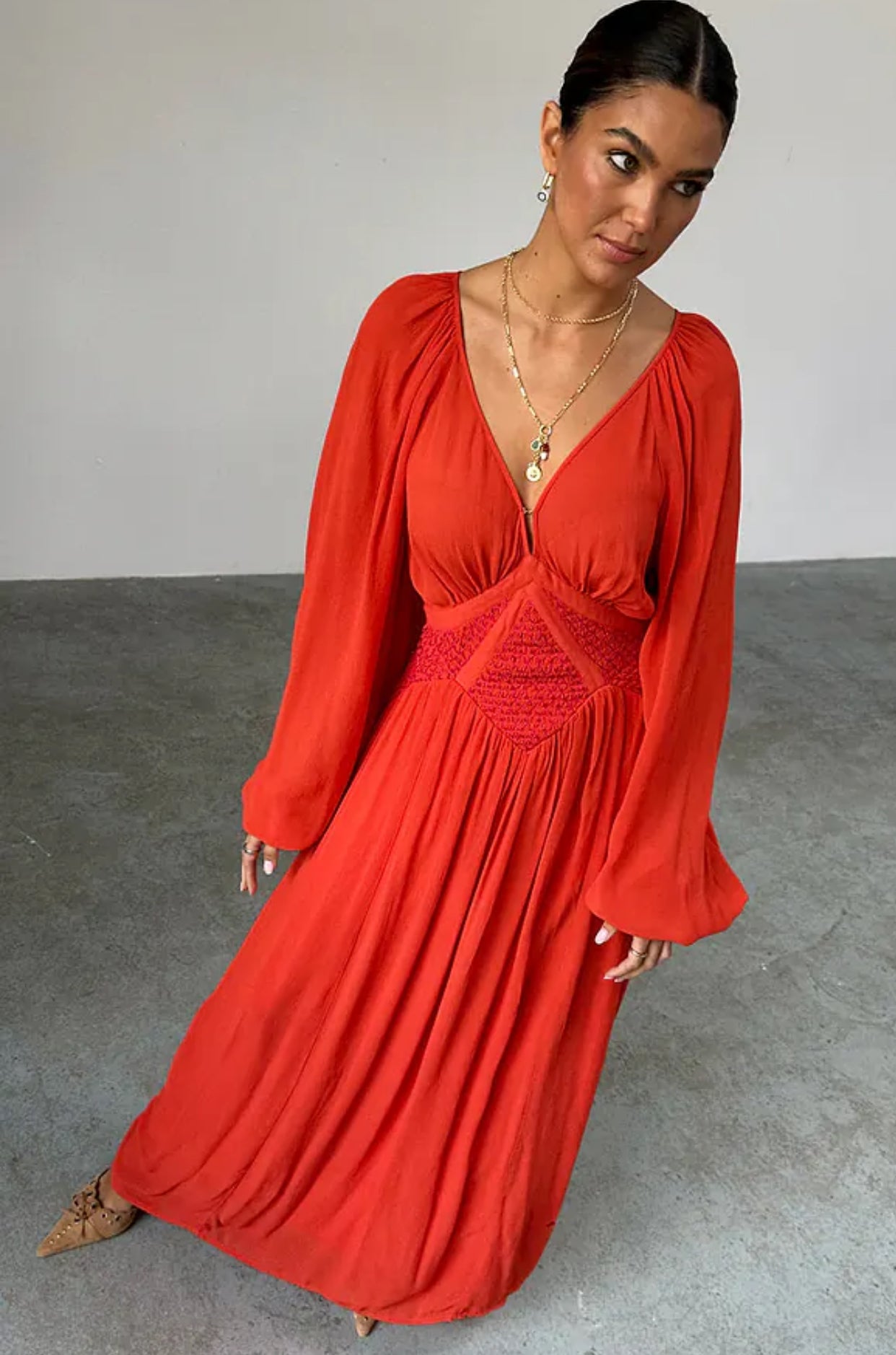 his dress is the perfect day to night outfit. The pink smocking along the midriff paired with the blouson style sleeves creates a floaty silhouette that screams effortlessly chic. Keep it simple with some sandals and minimal jewellery.
