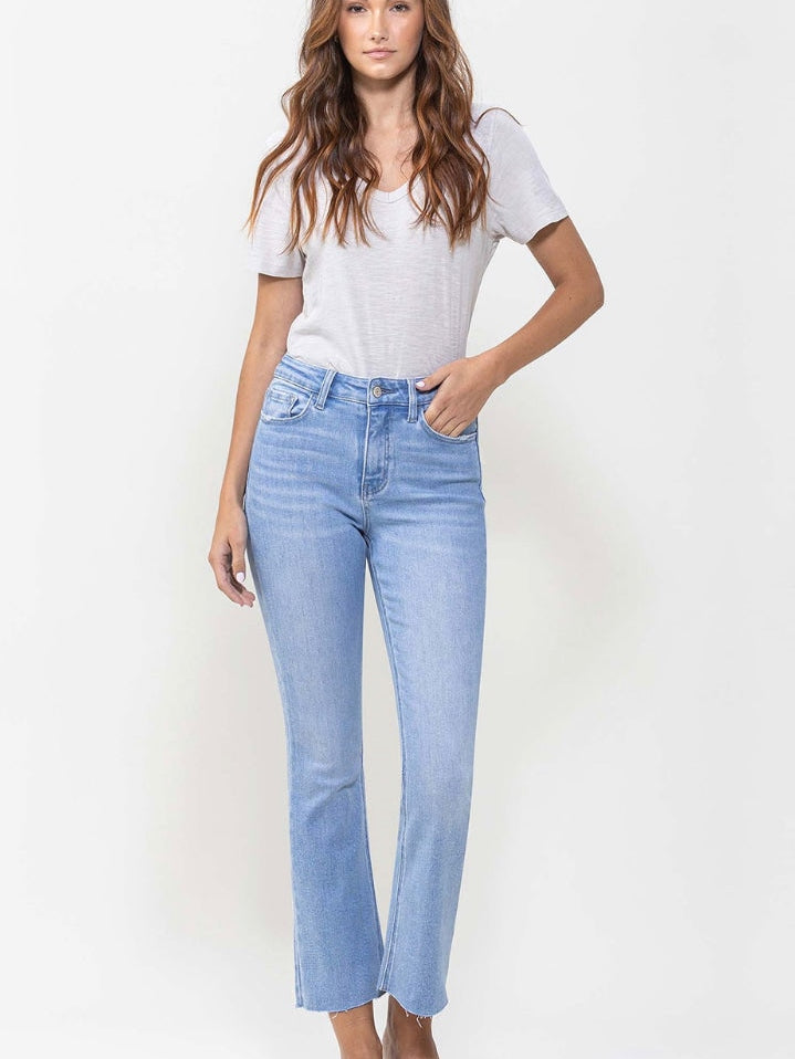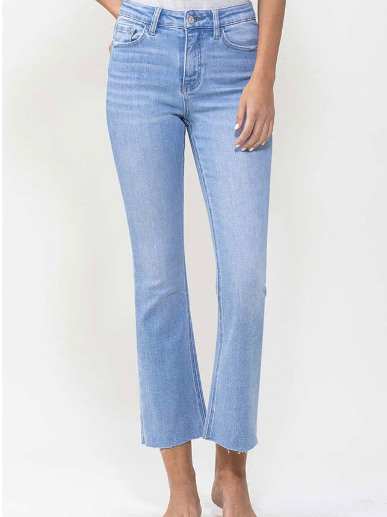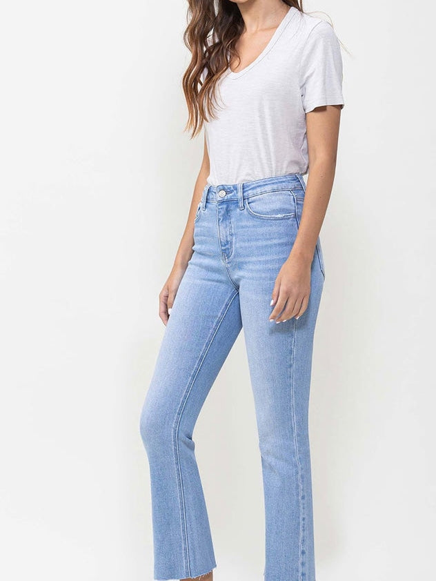 Comfort stretch denim. Cropped length, high rise, kick flare F. Rise: 10" / inseam: 26 1/2'' / leg opening: 16'' 93% cotton 5% polyester 2% spandex Model is 5' 9'' wearing size 26