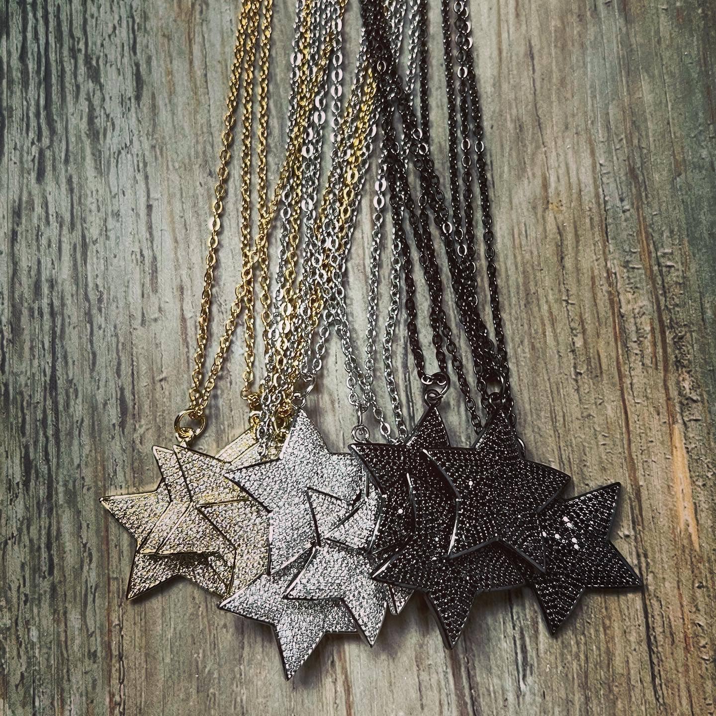 A gorgeous pave covered raised texture star on a simple stainless steel chain that is 20 inches long. Your choice of three colors: Silver, Black or Gold.
