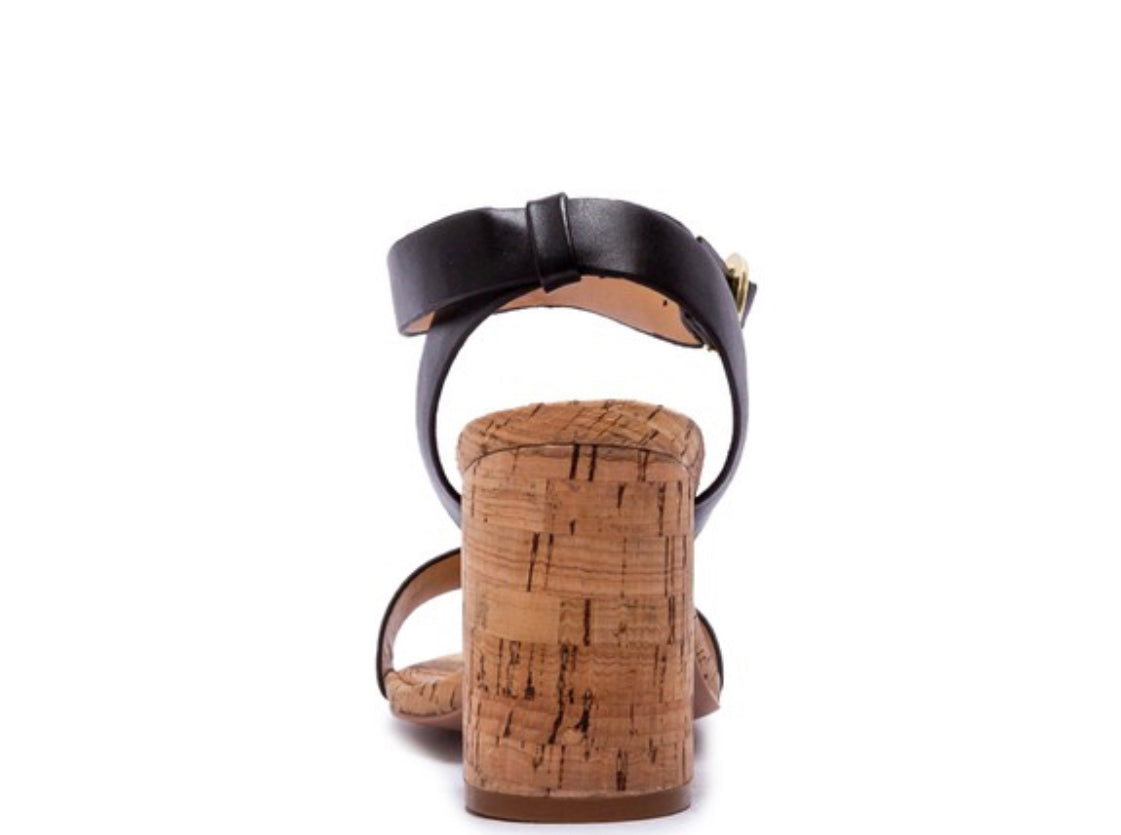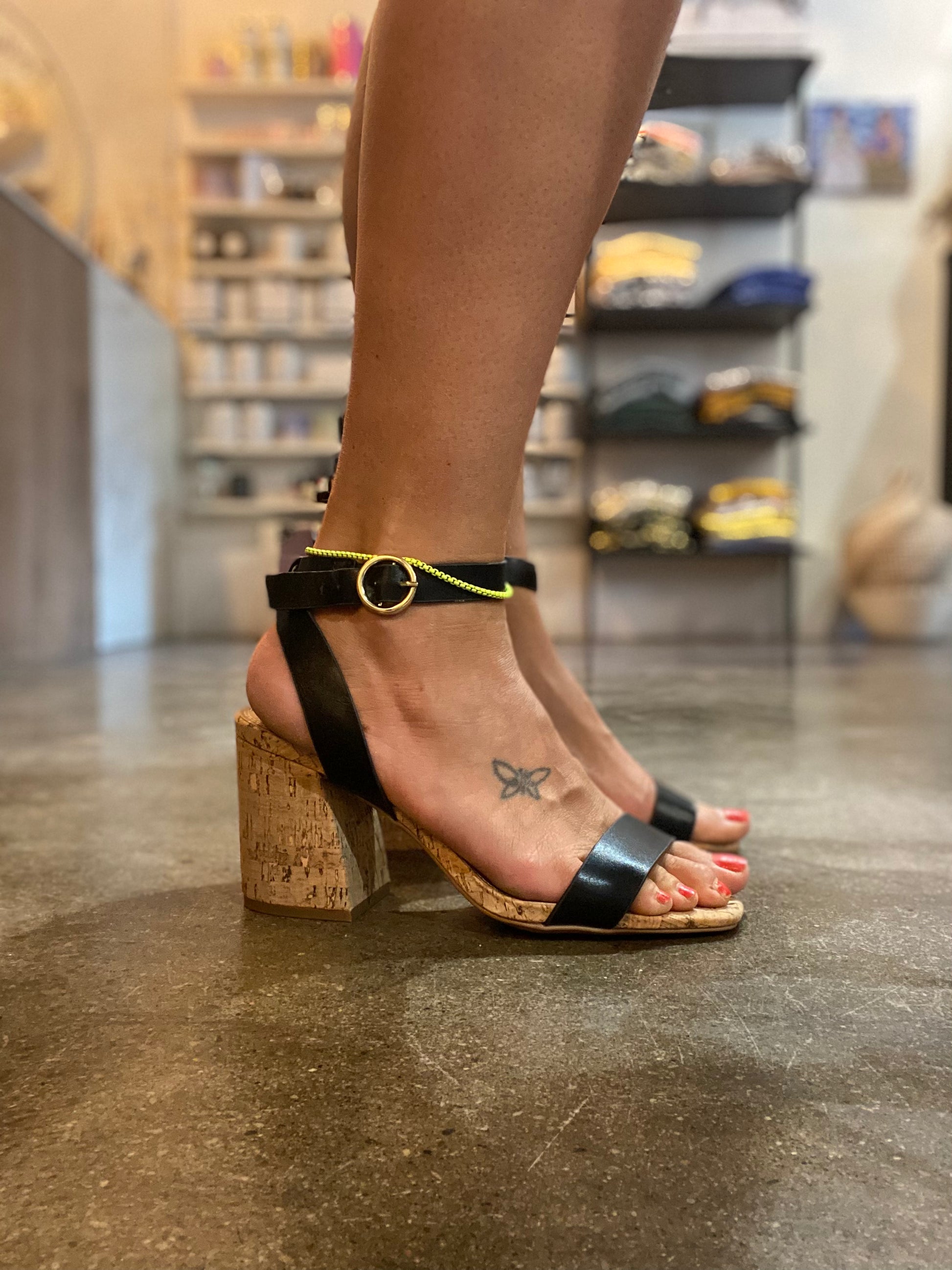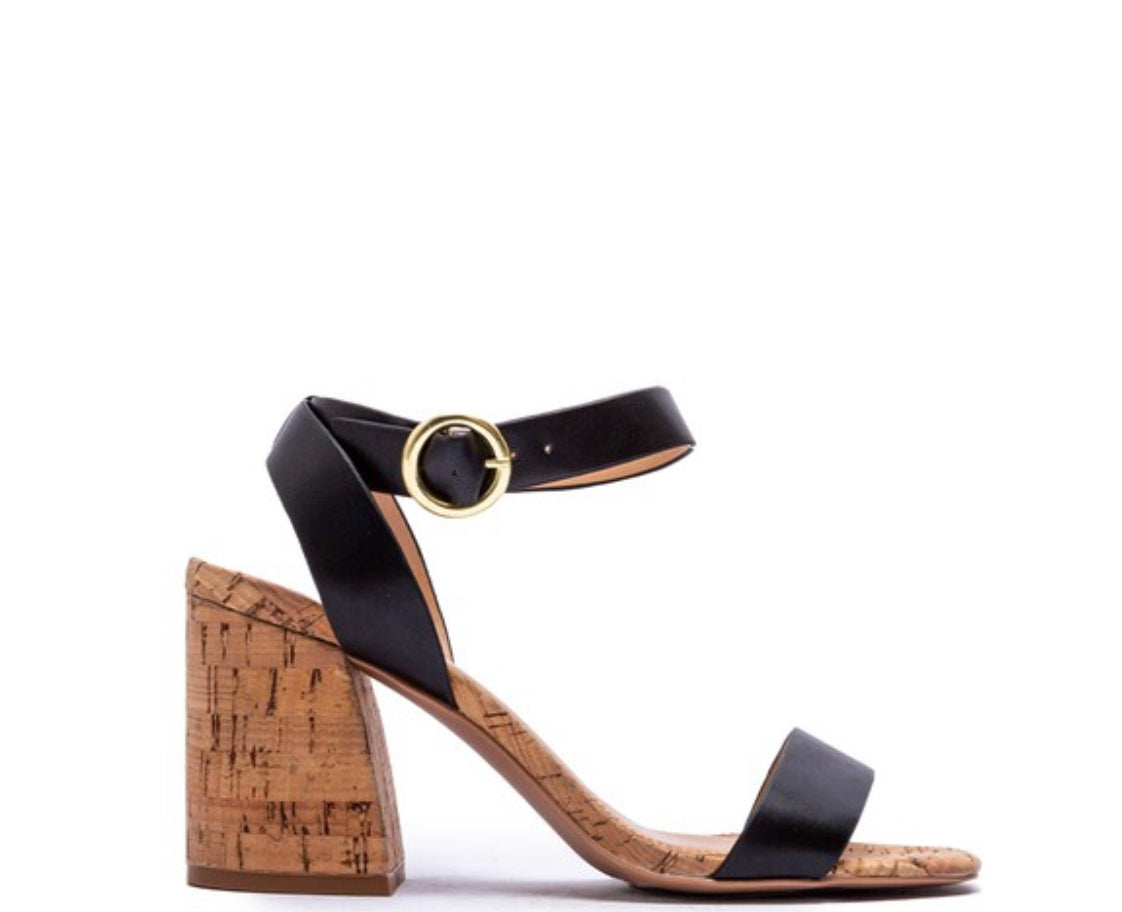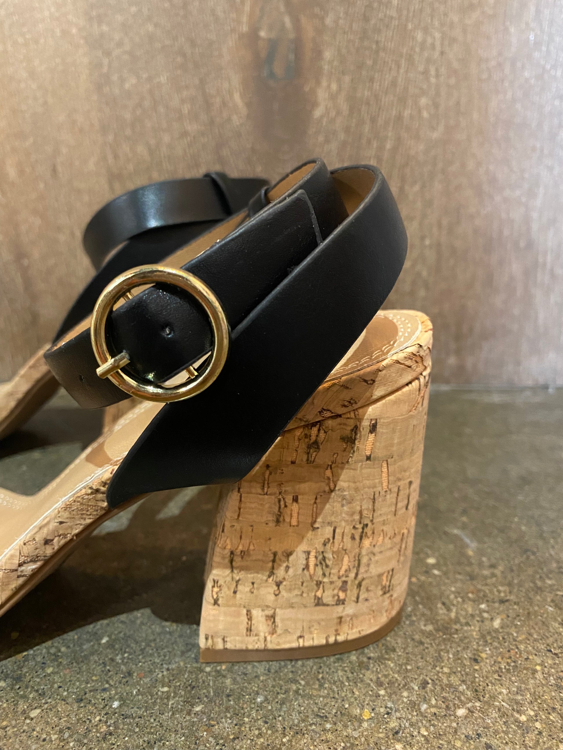 A lighter and more casual version of the Della. This heeled sandal has a cork sole and rounded gold buckle. Chunky rounded heel. Fits true to size