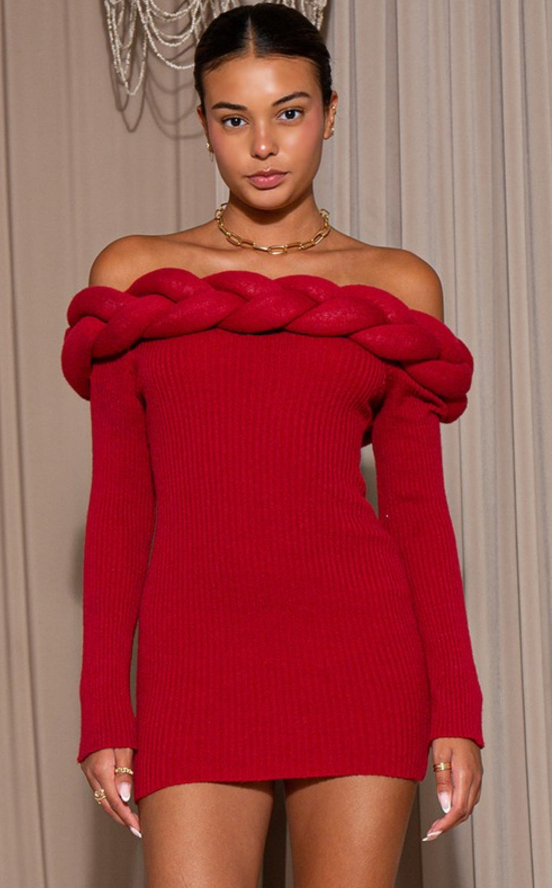 Ribbed Knit tunic dress featuring an off the shoulder braided detail along shoulders.  Can be worn as a top or tunic dress over tights.