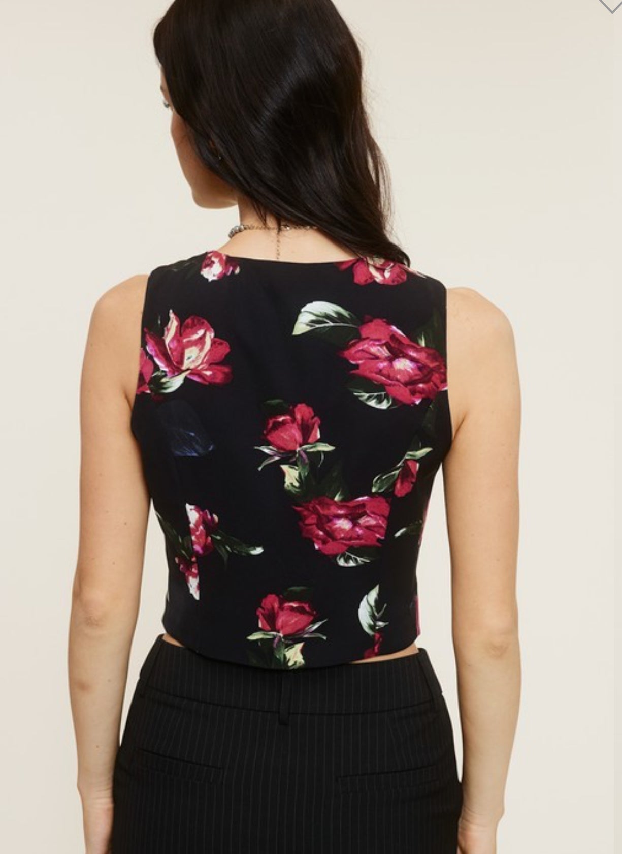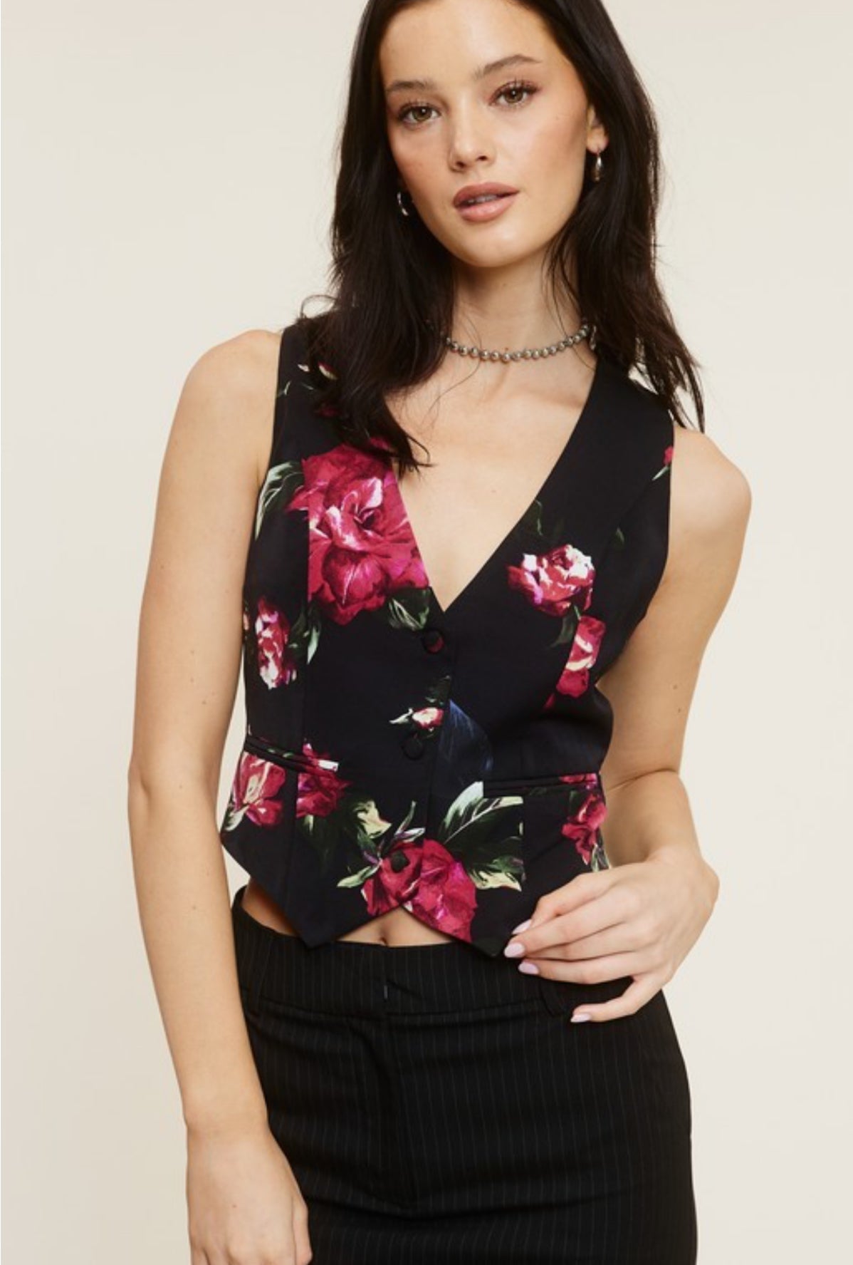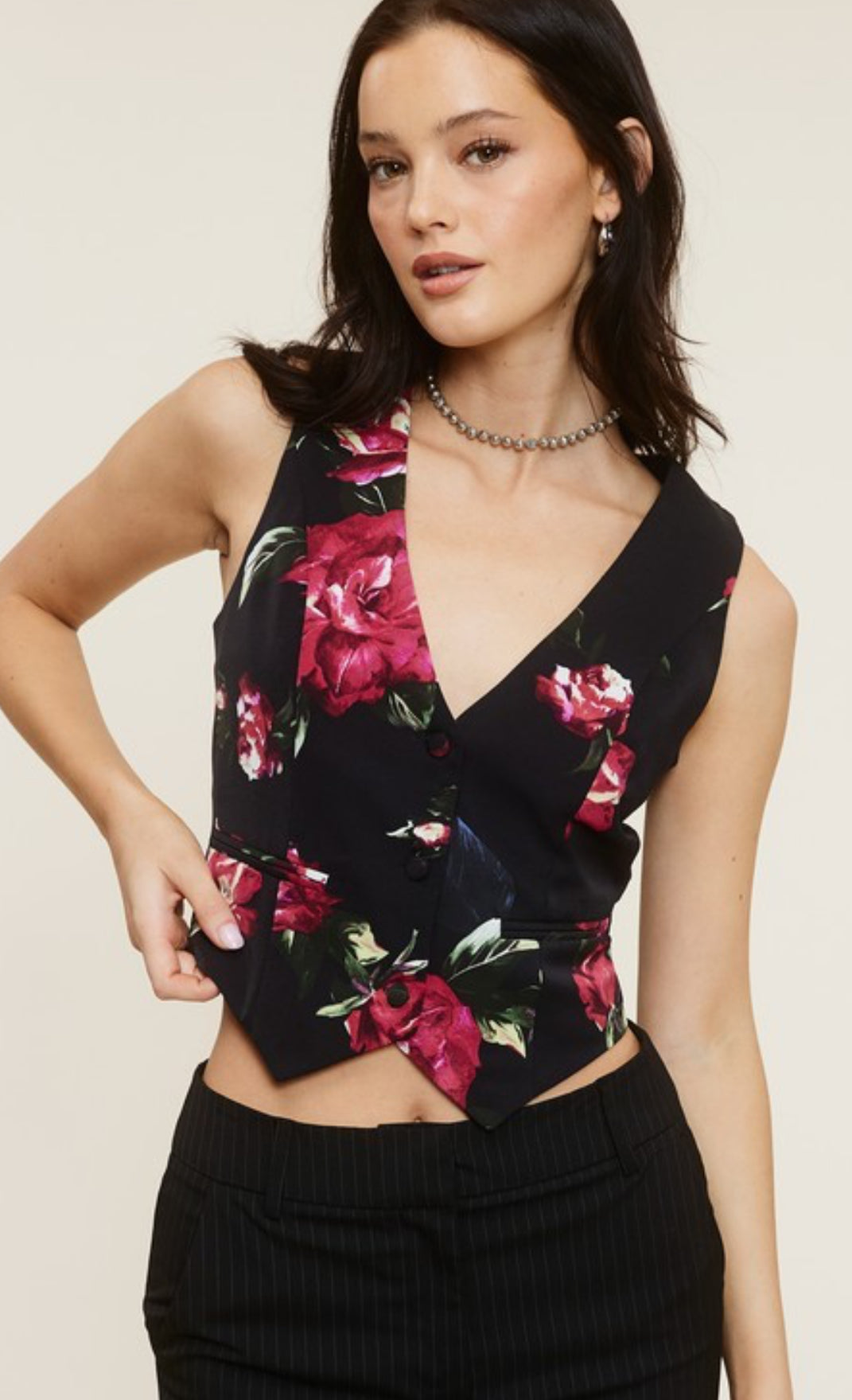 Vintage floral boho influenced satin style vest. Tailored fit, rose print.