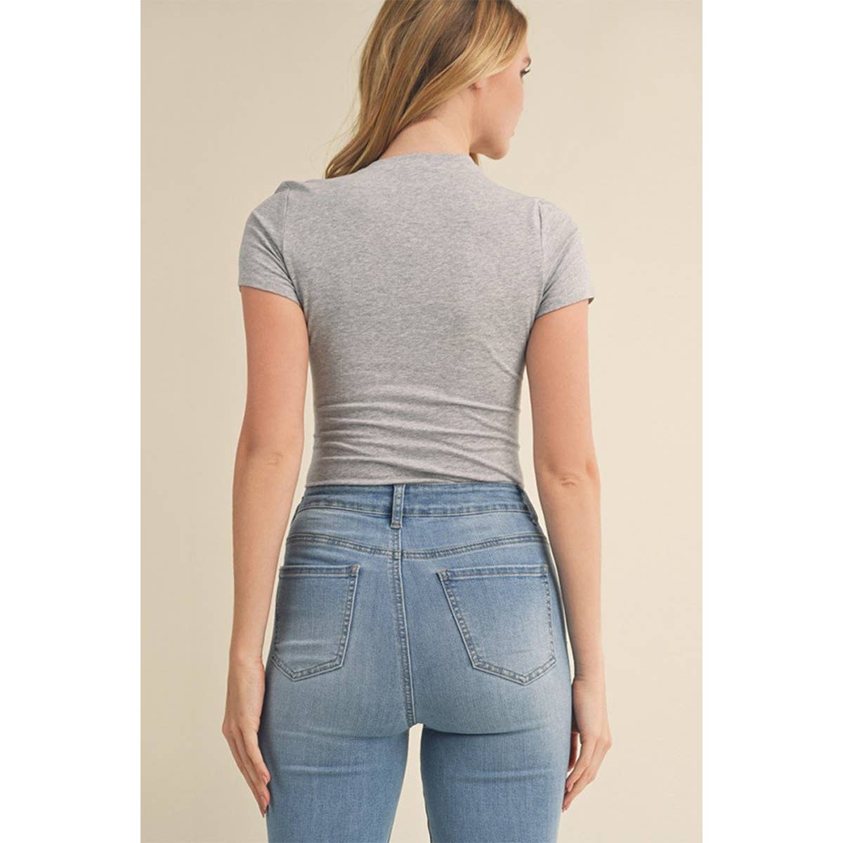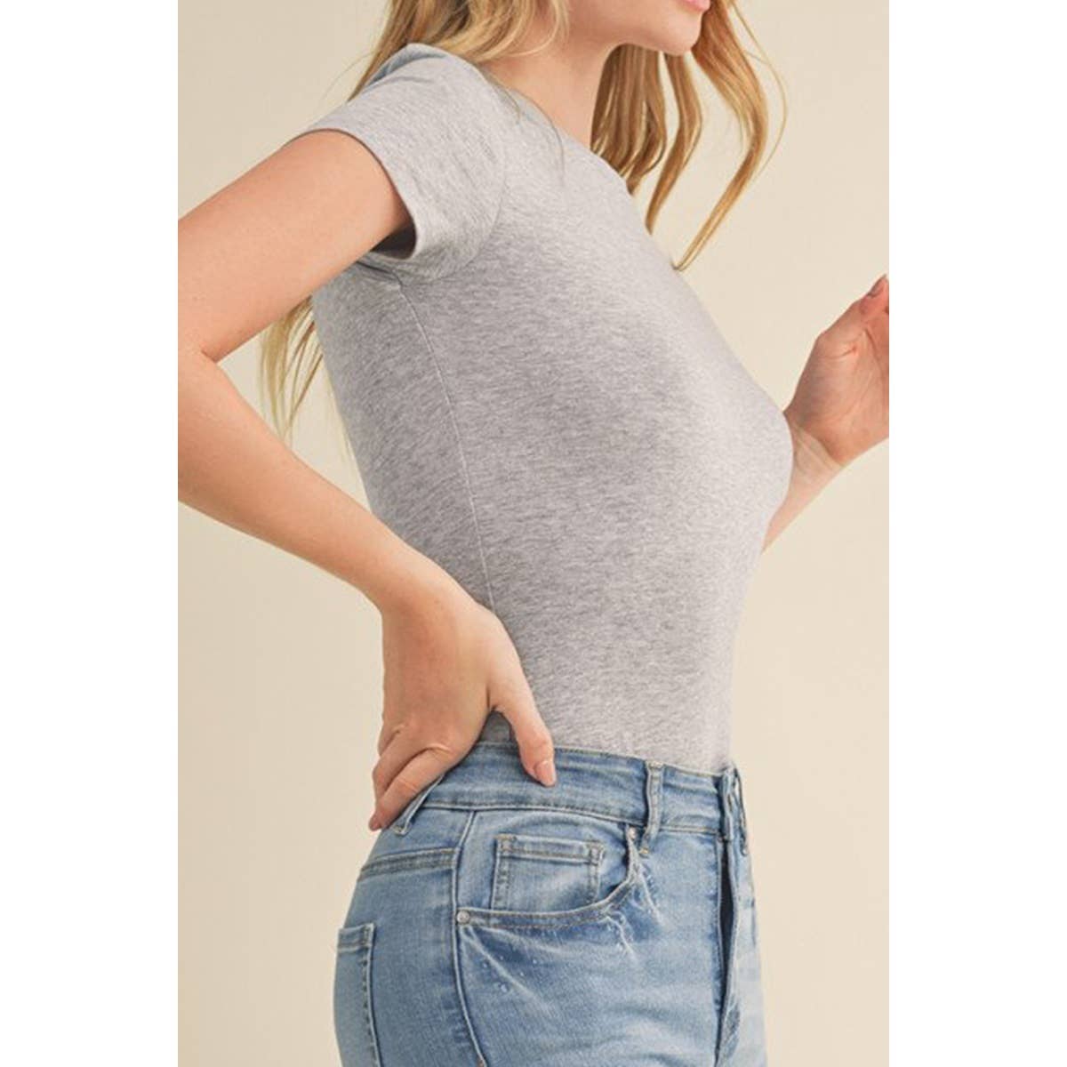 ROUND NECK BOY TEE SHORT SLEEVE BODYSUIT A round neck boy tee short sleeve bodysuit in a cotton spandex jersey knit fabrication Double metal snap button twill tape