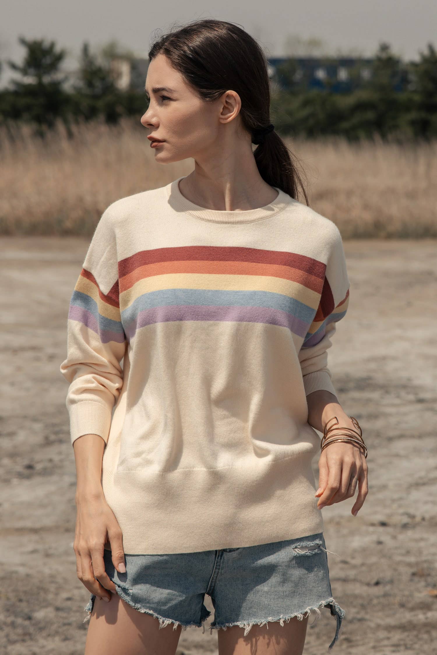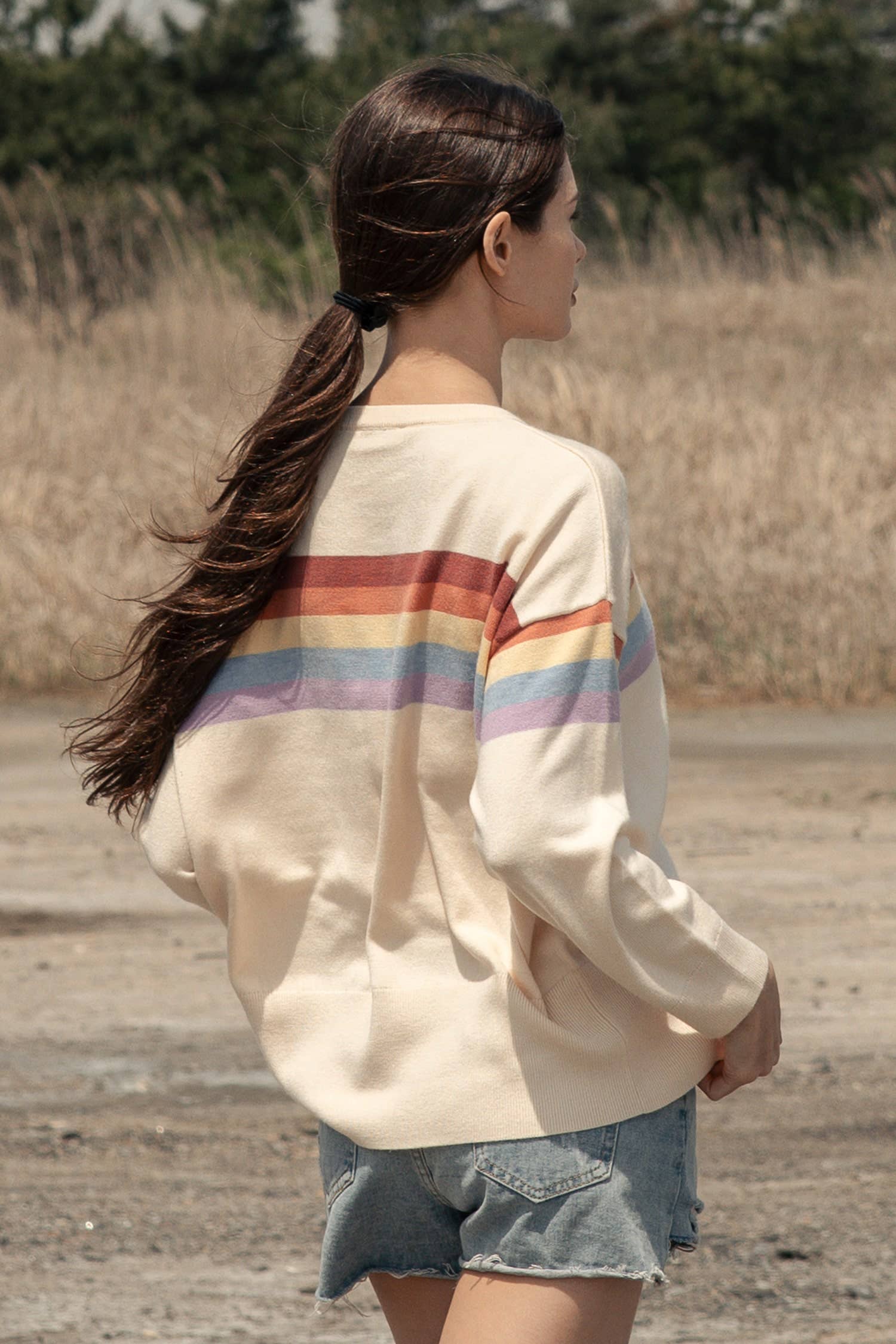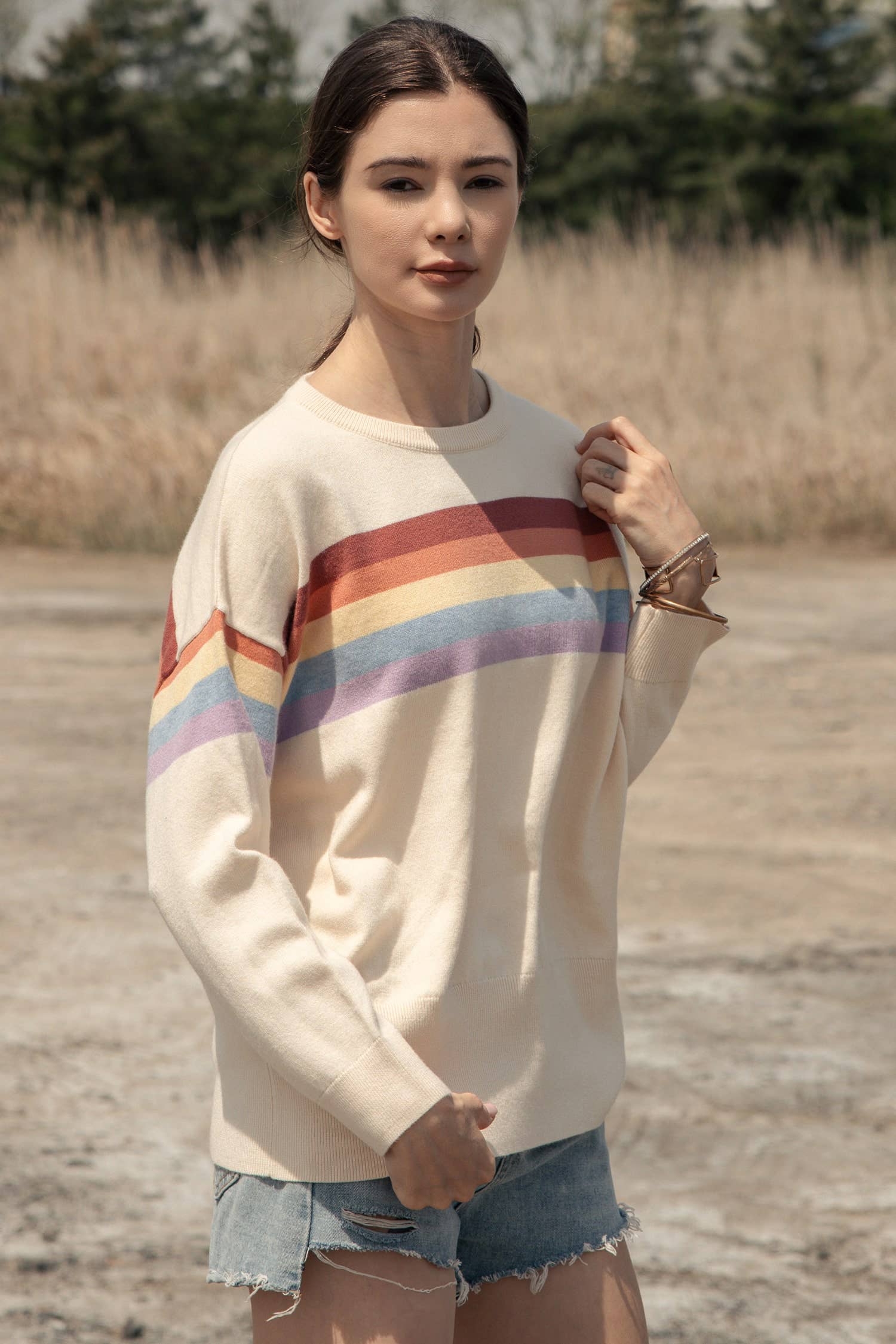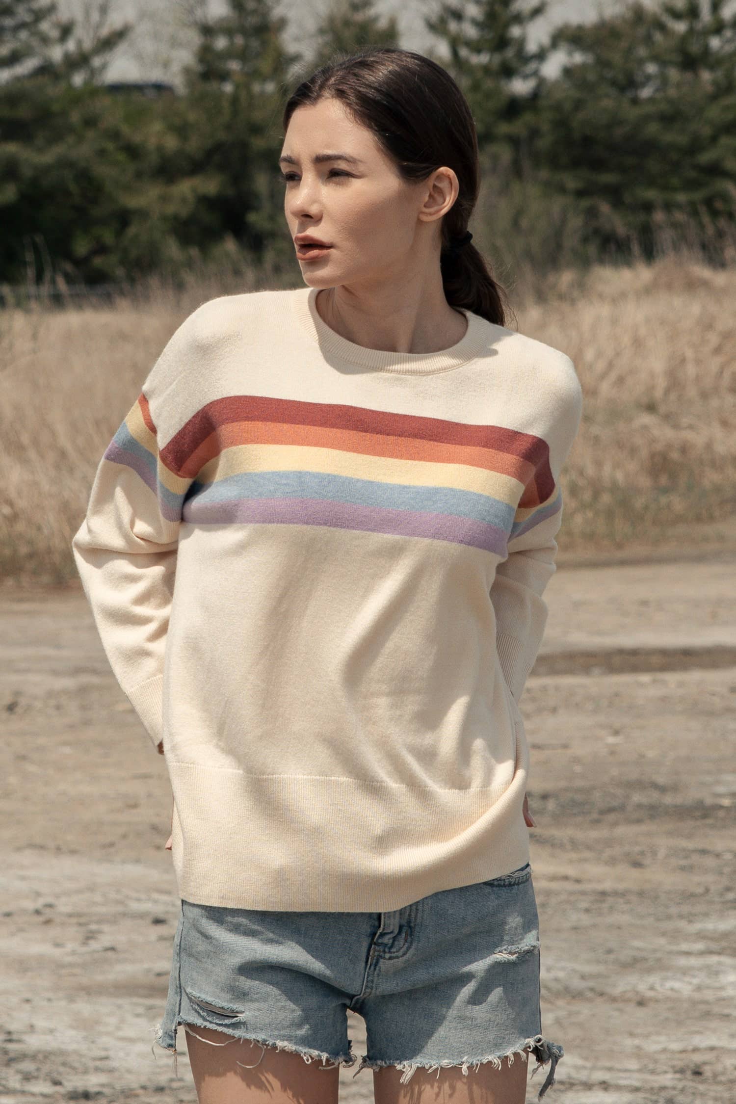 Lightweight pre fall knit with multicolor band striping across the bust. Crew neck and loose fit.