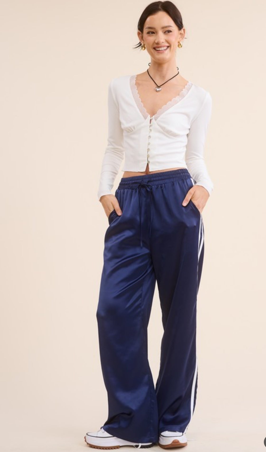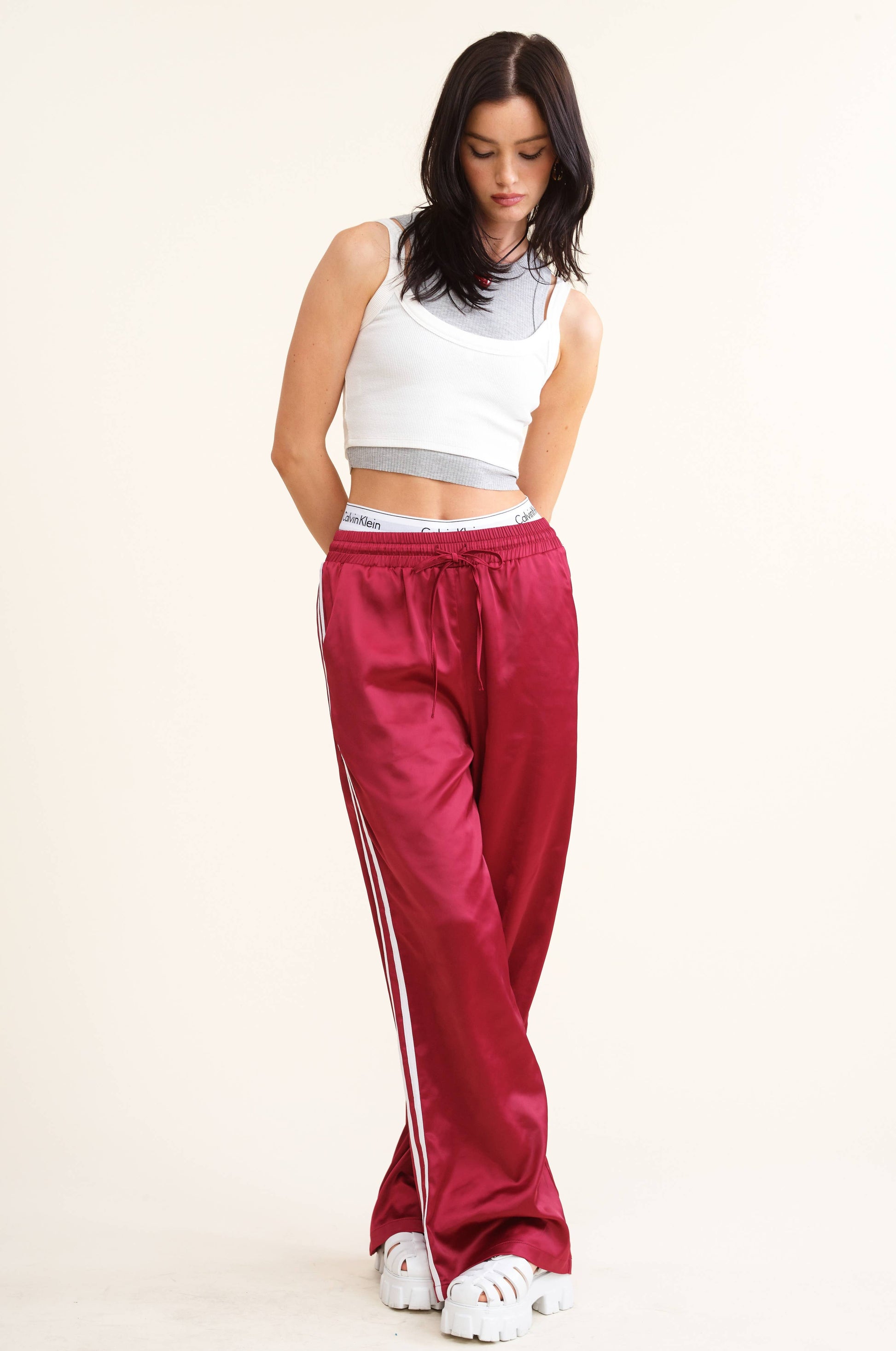 Summer 25 edition of our favorite Sporty Satin-Effect Track Pants. Our Track Pants are sporty, chic, and comfortable. Crafted from a satin-effect fabric, these full-length pants feature an elasticized drawstring waistband, white contrast stripes on the side, two side pockets, and a straight leg: