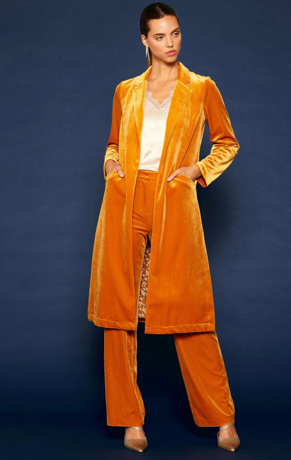 The perfect match to our best selling speak easy dusters these velvet trousers feature a straight leg, hook and eye zip closure, pockets and a stretch waistband.. soft, comfortable and unlined.