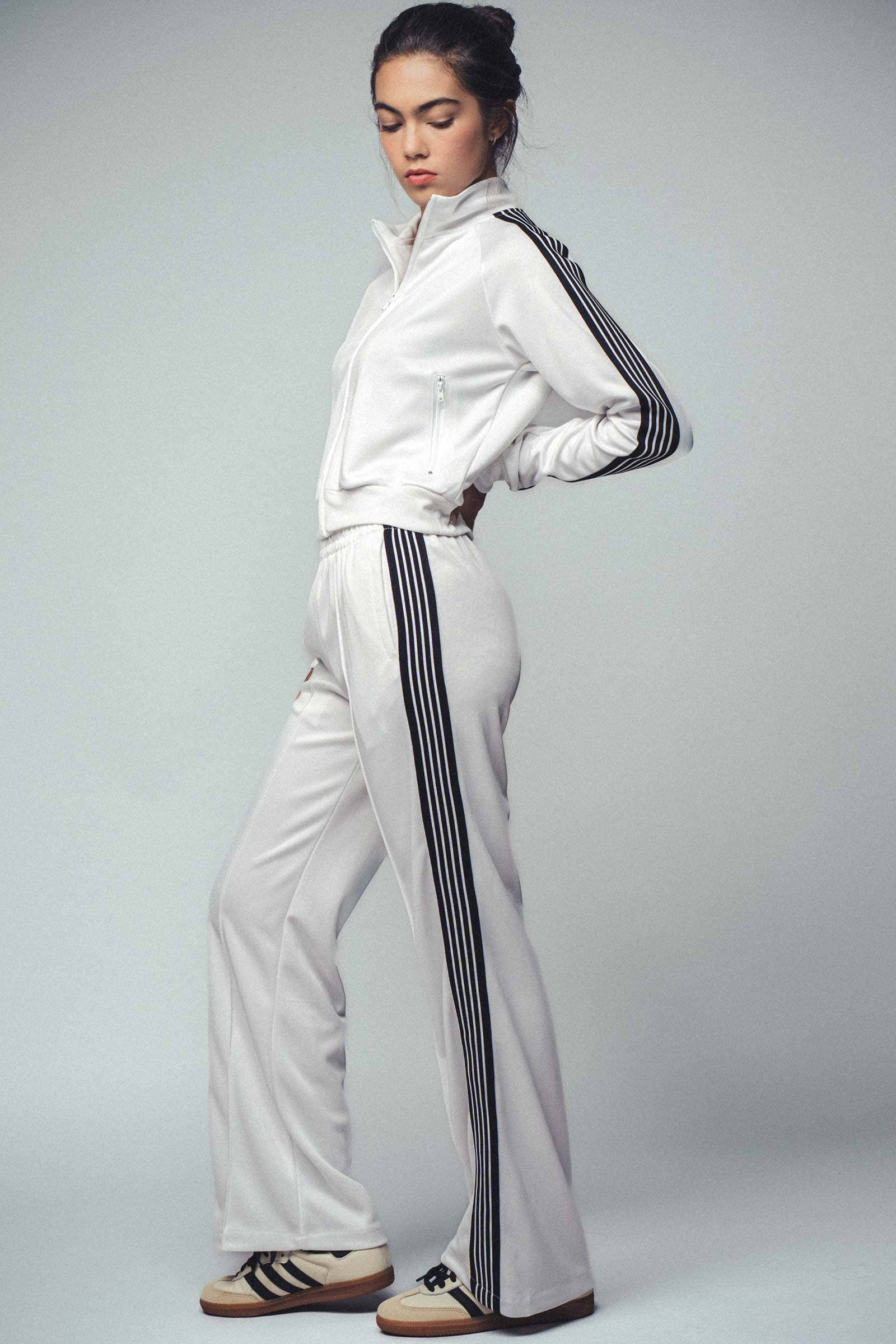 These crisp wide-leg pants feature a white base with bold black multi-stripe side panels for a sporty yet polished look. The front center seam adds structure, while the elastic waistband ensures a secure and comfortable fit, perfect for versatile spring and summer styling. Features: • 100% Polyester •