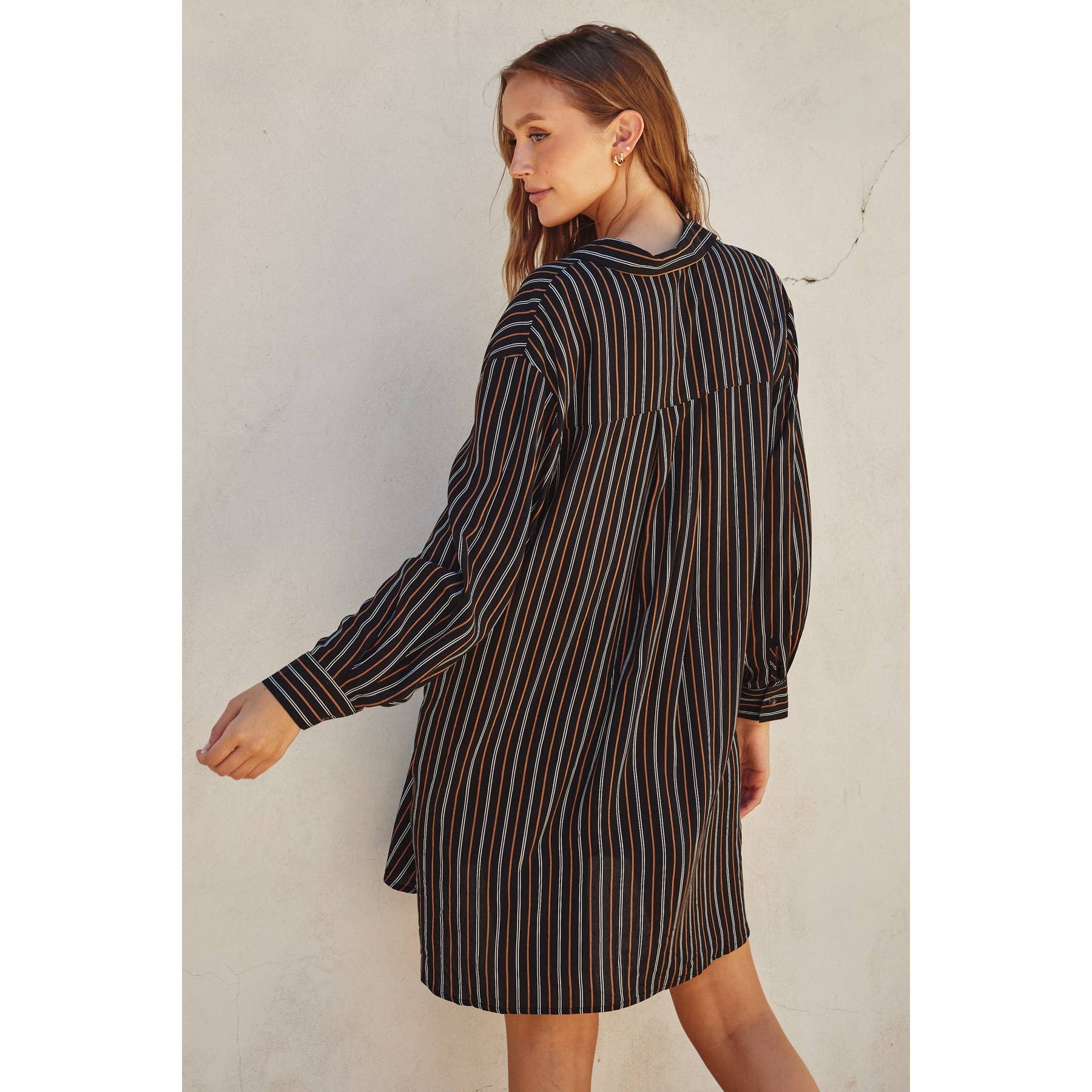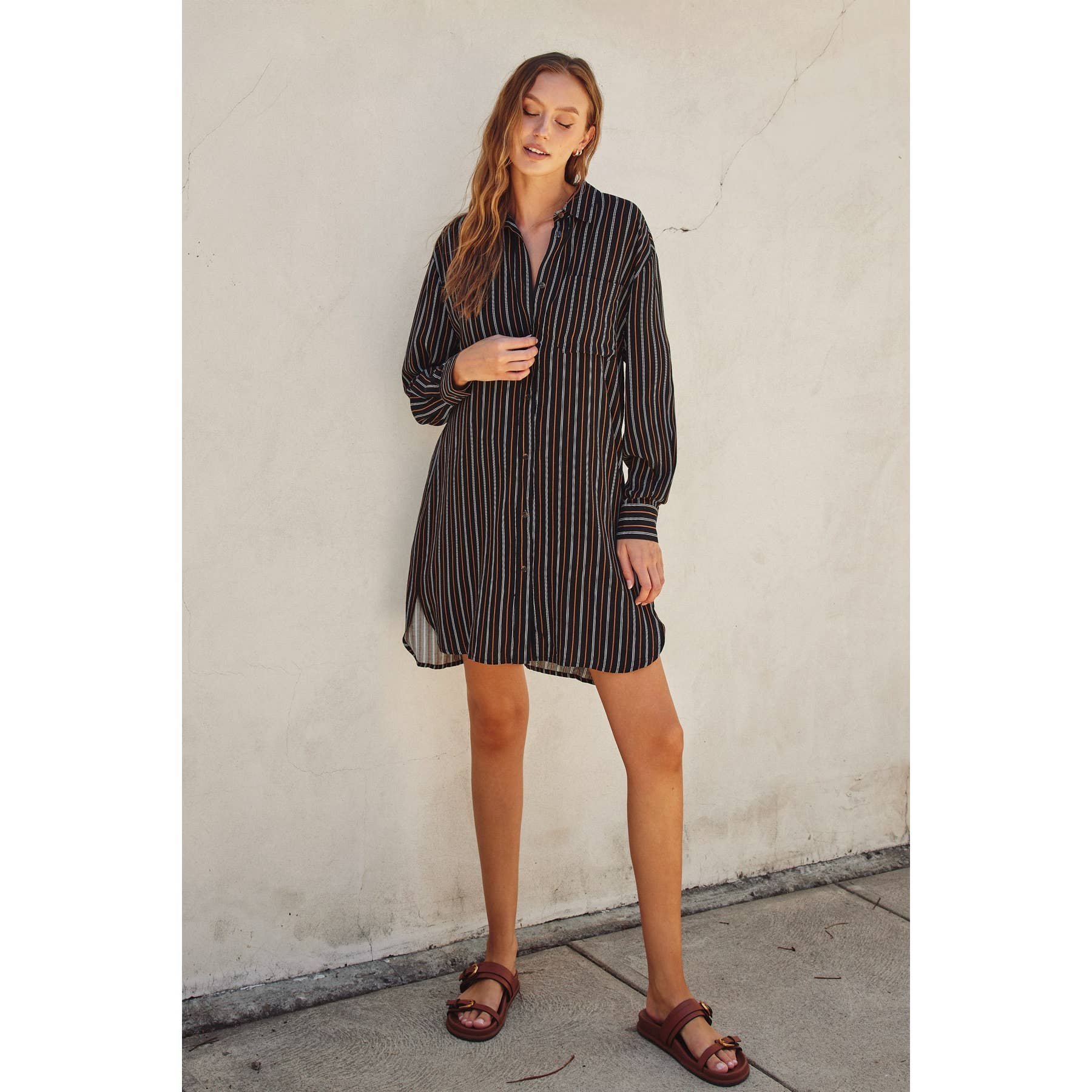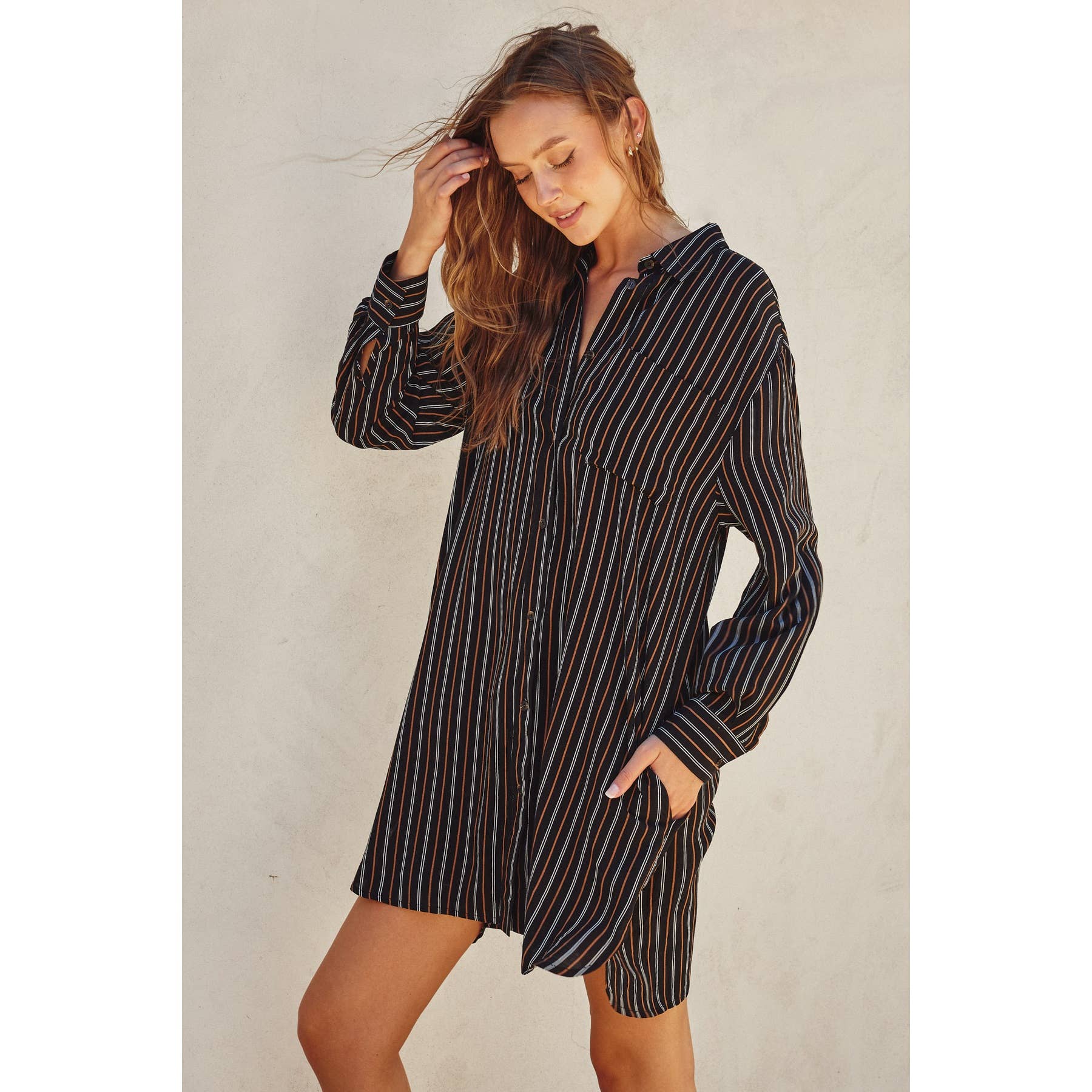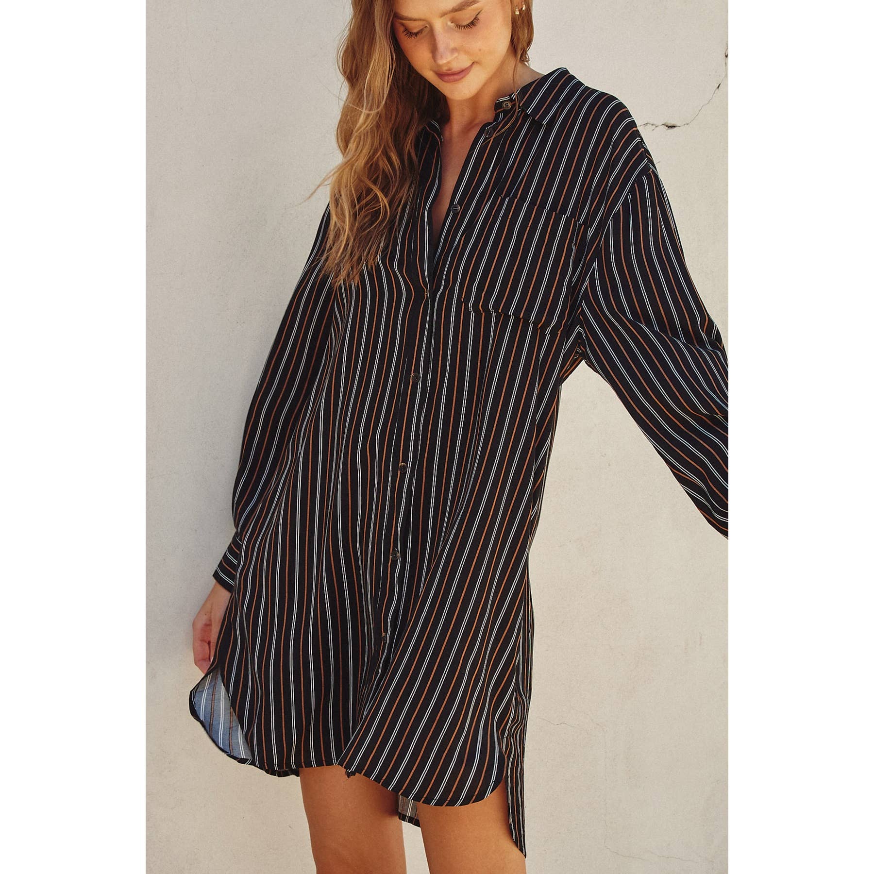 Monroe Stripe print shirt dress featuring a collared neckline, round hem, and button closures. Model is 5'10" and wearing size Small. - Shirt dress featuring a collared neckline - Slight high-low hem and button closures - Unlined Shell: 100% Rayon Lining: None