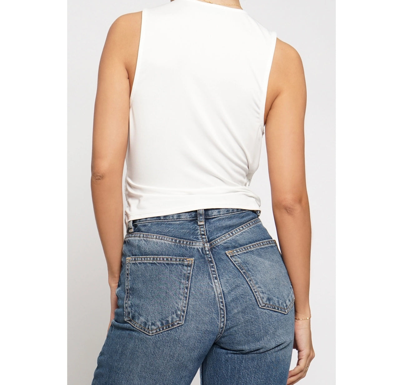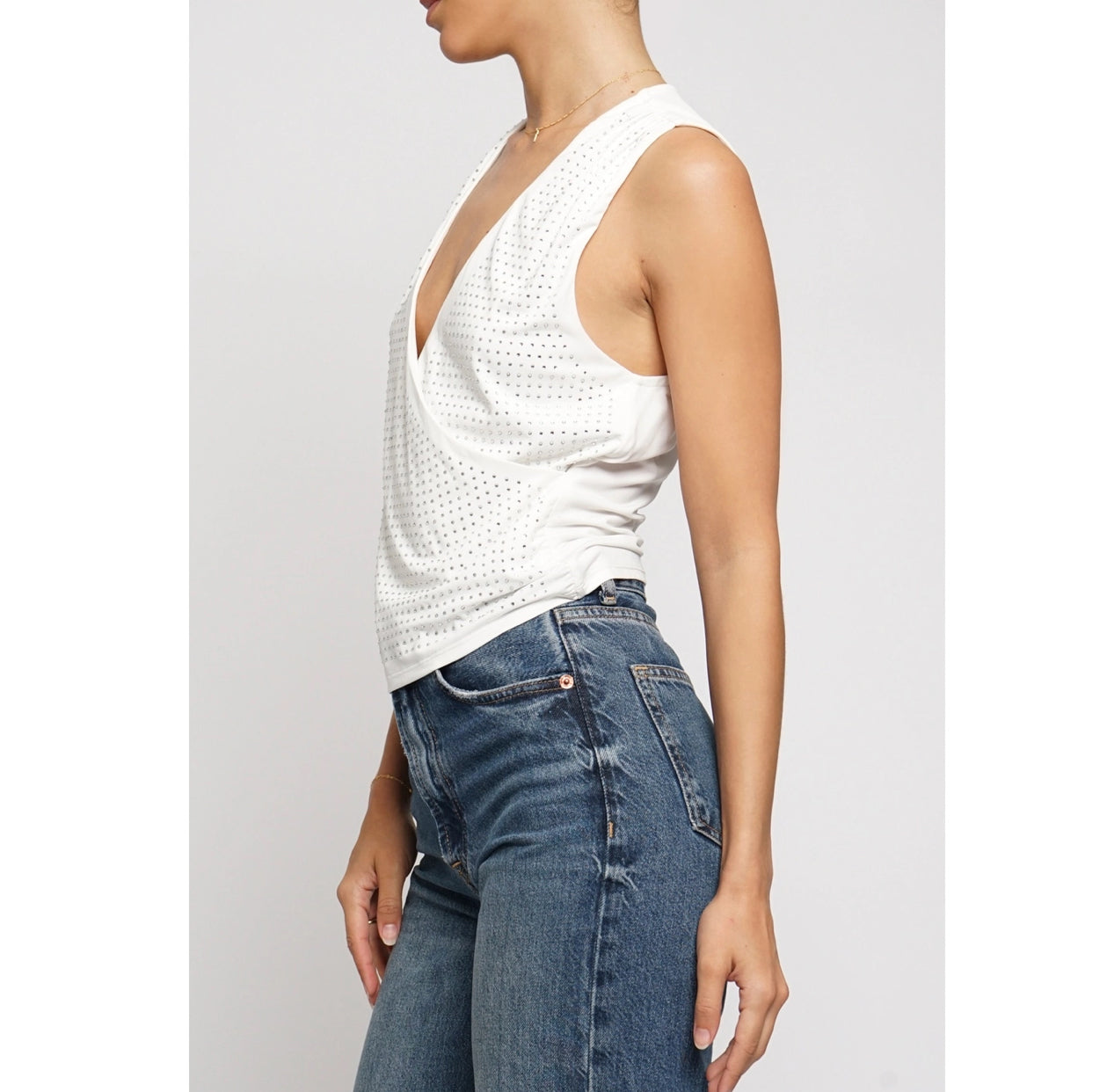 - 95% Polyester, 5% Spandex - Knit - Sleeveless - rhinestone details - V-neck - Faux wrap crossover