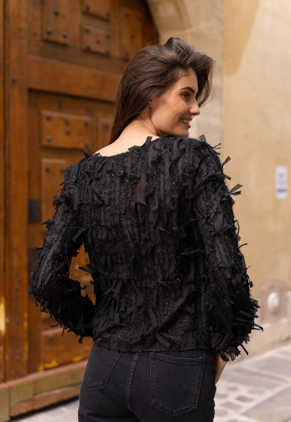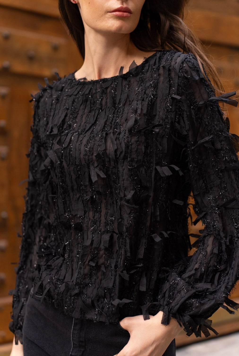 Textured blouse: - sophisticated material with fringes and metallic threads - long sleeves - boat neck