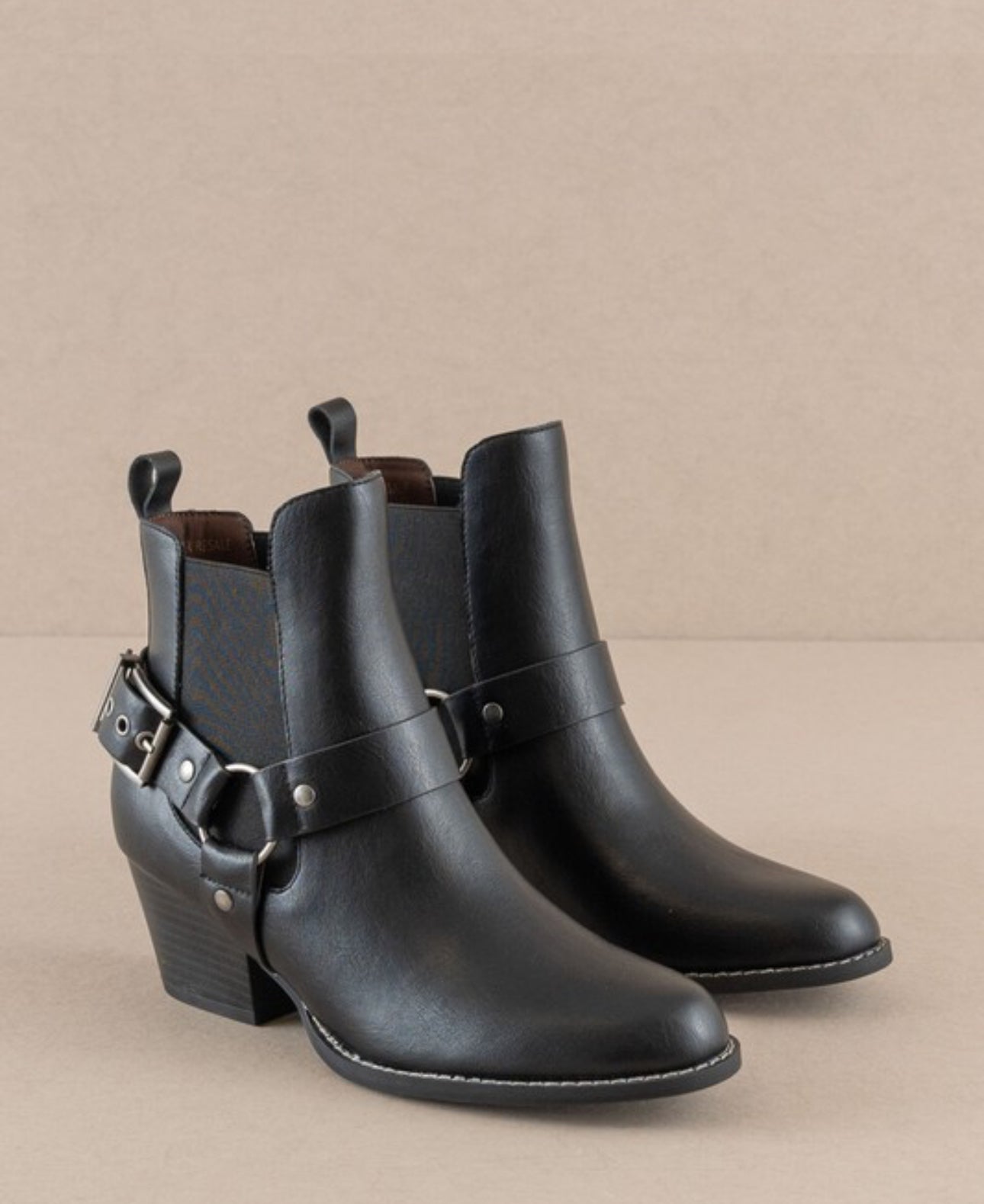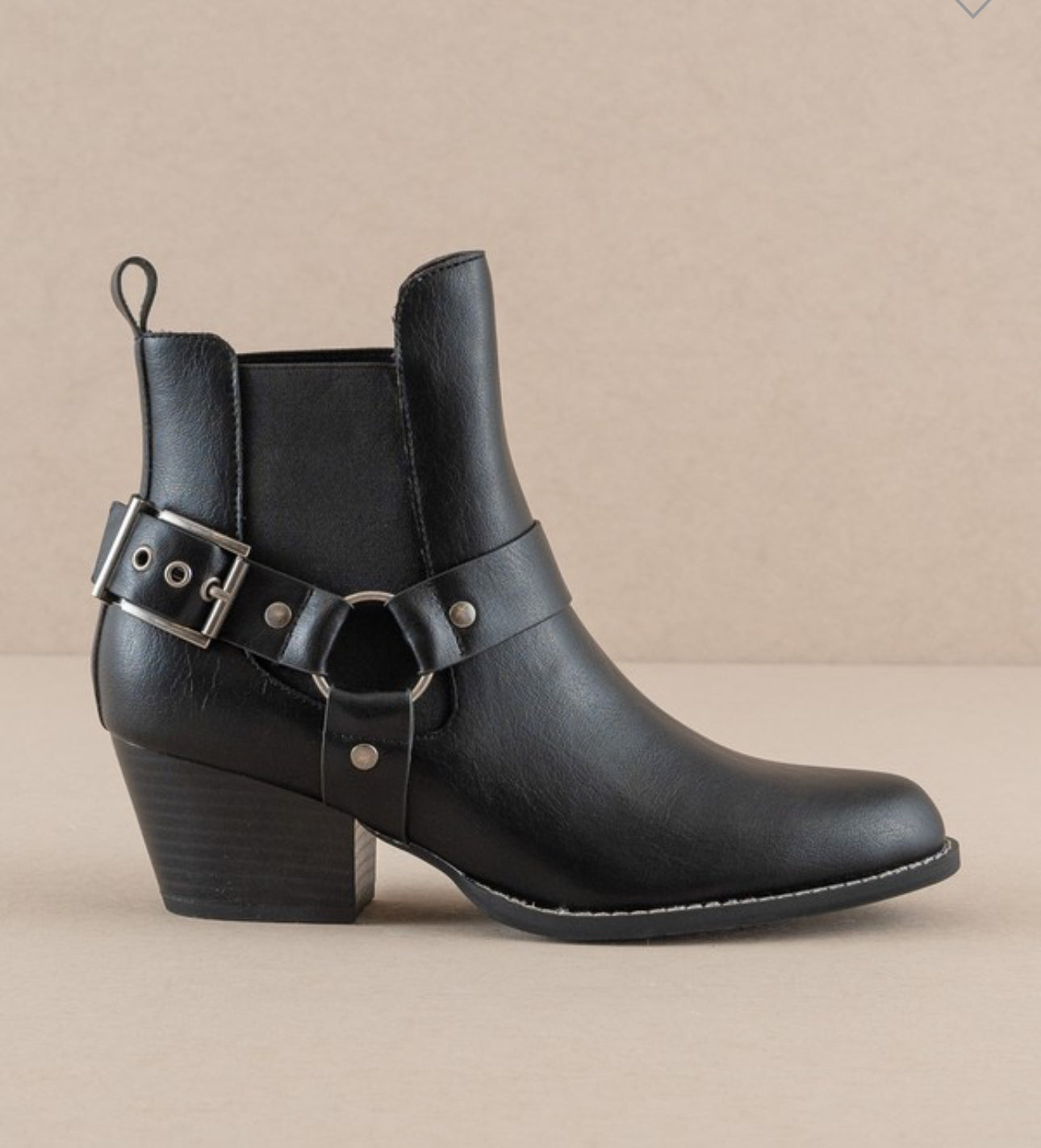 This is the must-have moto-bootie of the season. Styled up with a pointed toe and gorgeous vegan leather.