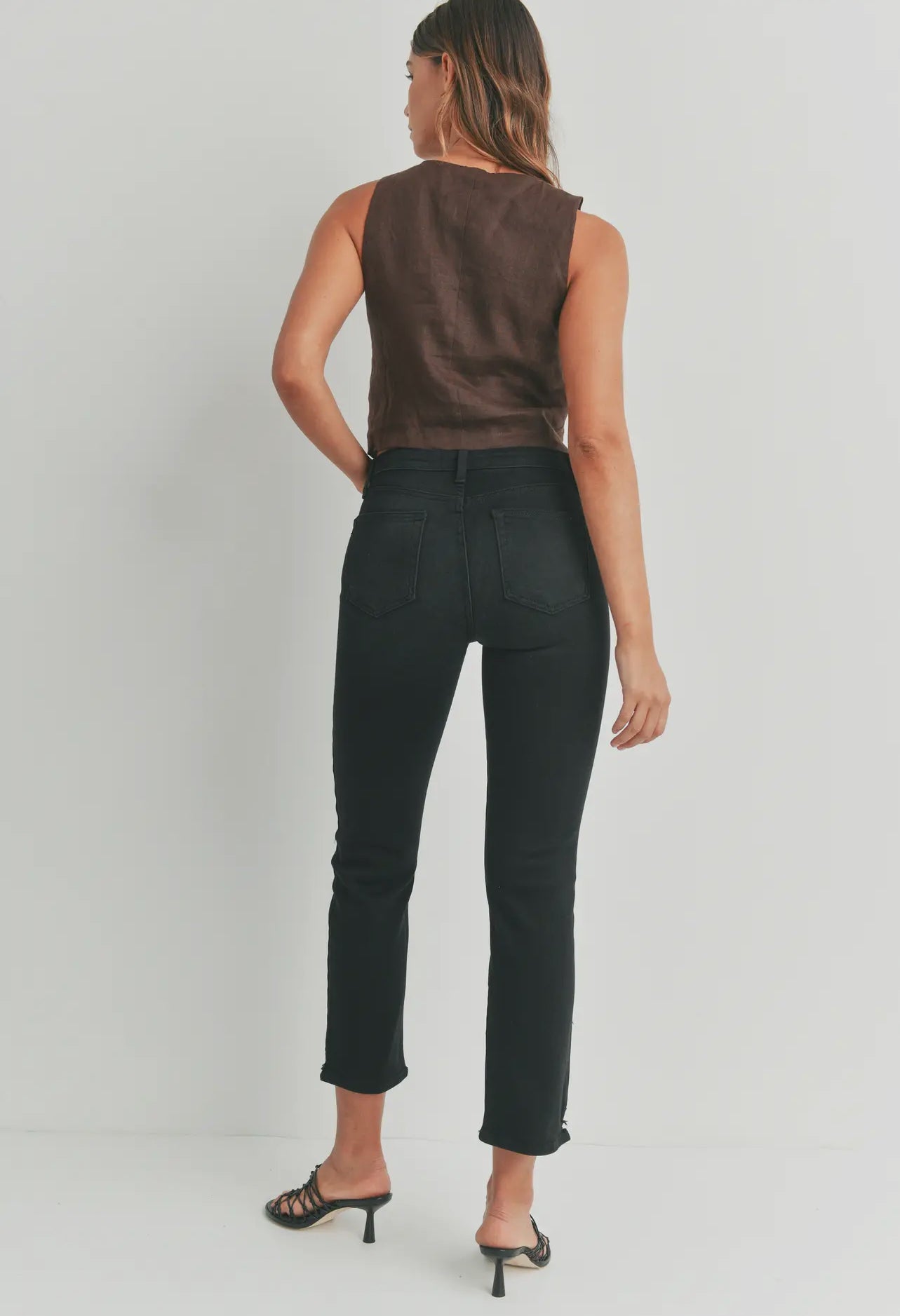 10" Rise, 26" Inseam, 9" Opening Washed Black - High Rise Crop Flare with Distressed Hem