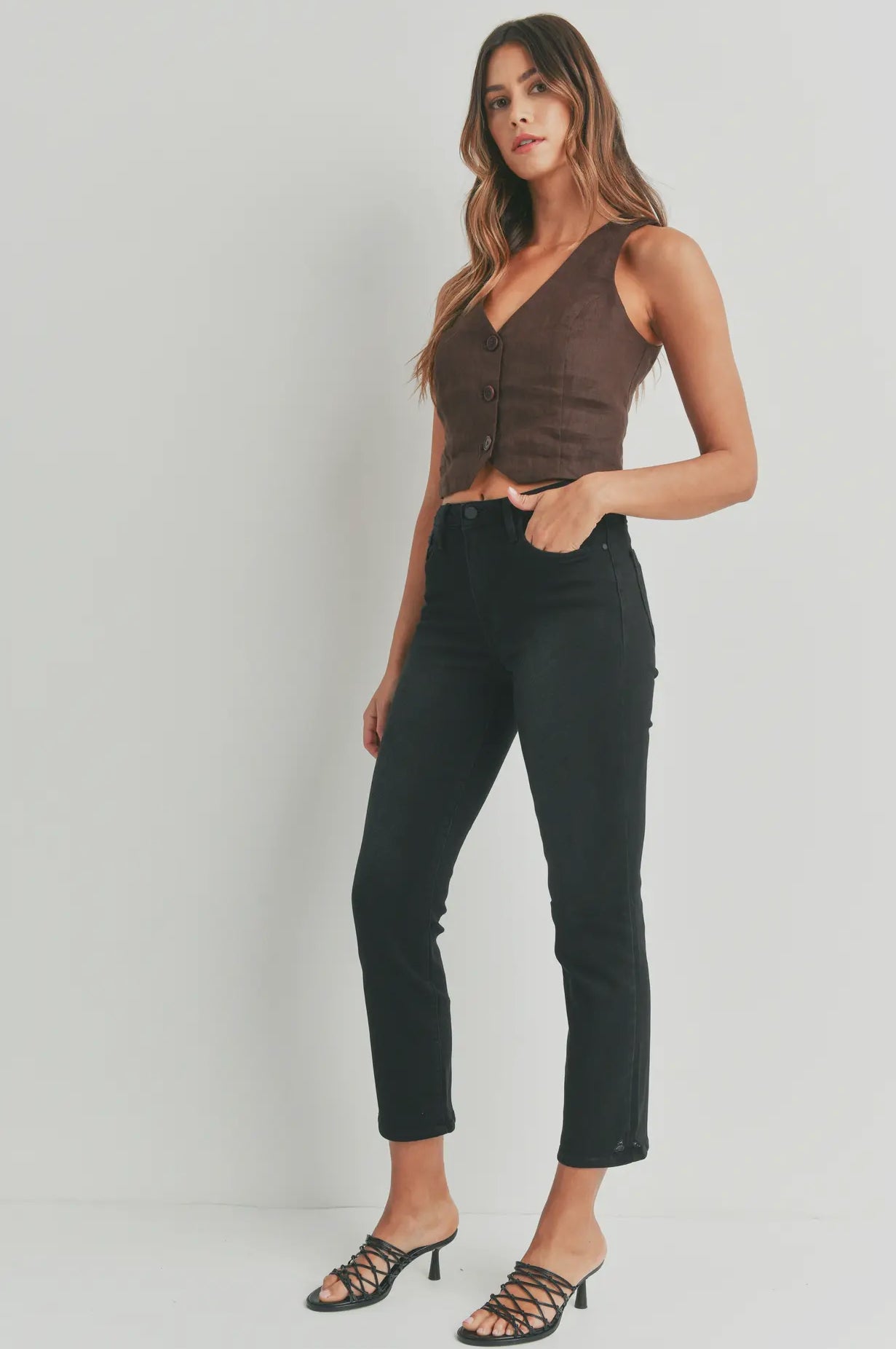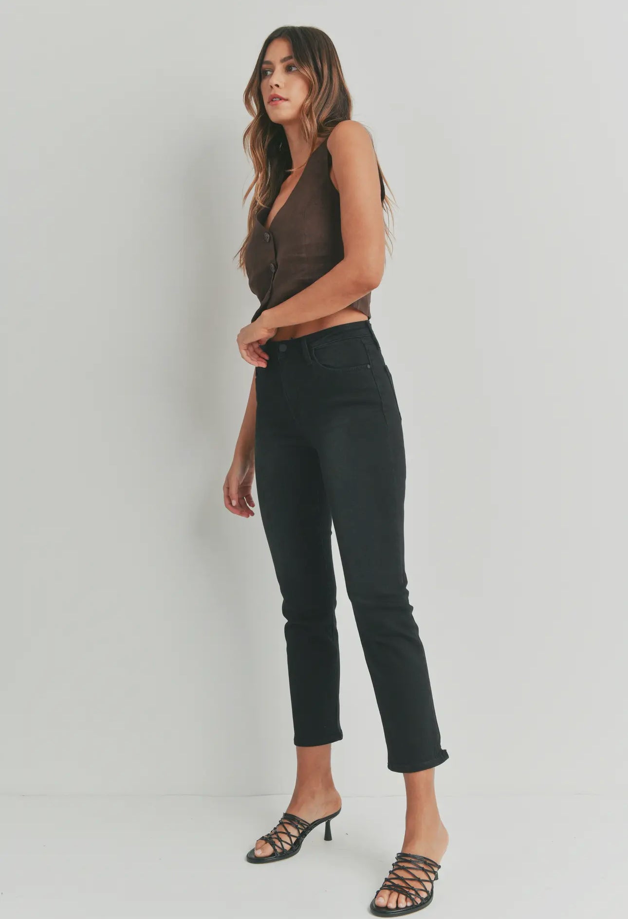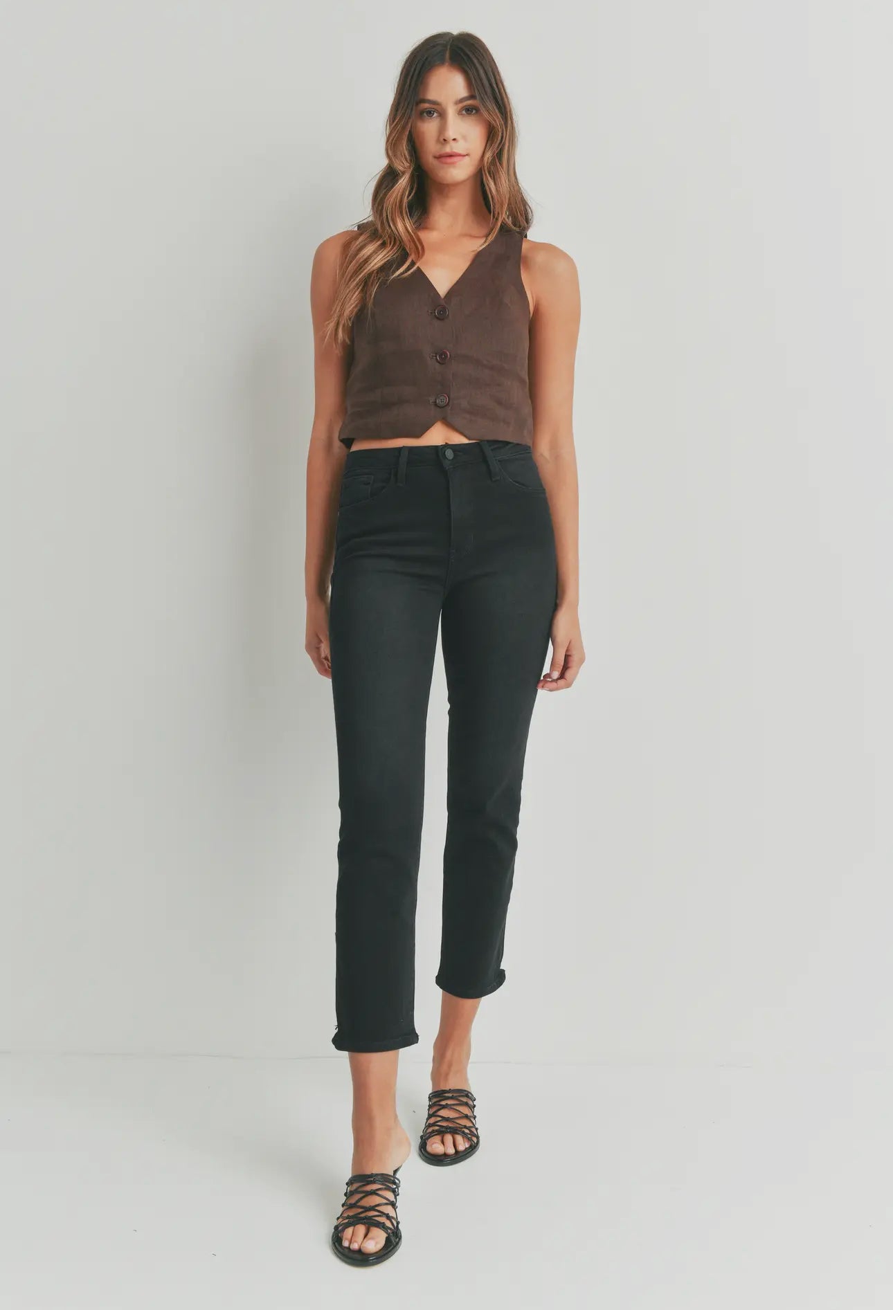The black jean is such a wardrobe staple! The Frayed Crop Flare is such a great choice!  Wherever you're going in these jeans, you're going to get noticed. A high rise paired with a distressed hem adds movement and drama to every dance floor you hit.