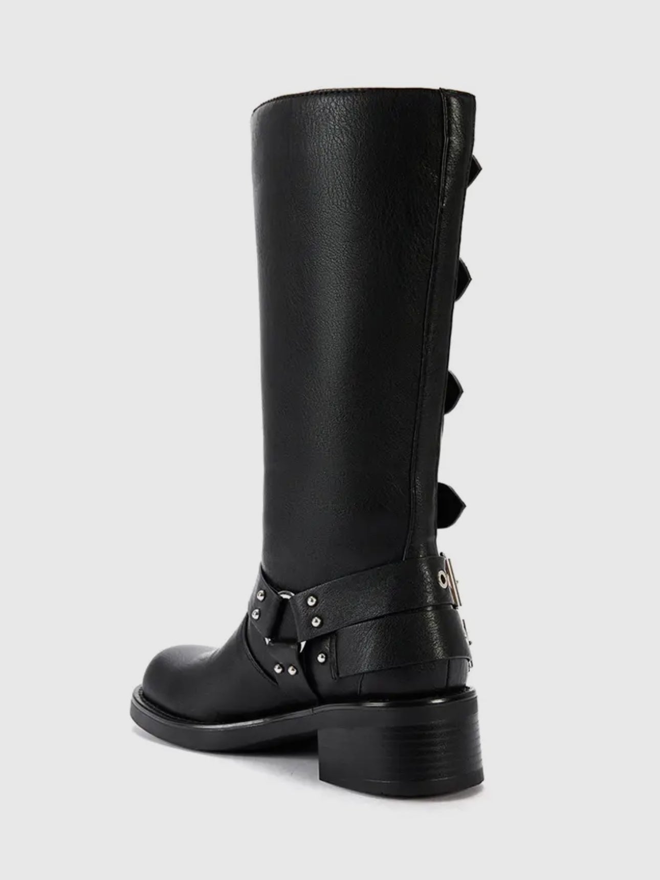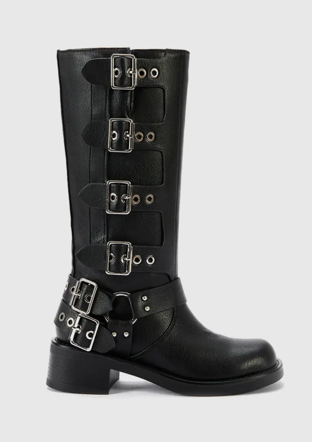 Experience the classic sophistication of the BUCKLEDUP-BLACK FLAT BOOT. Crafted from black faux leather, this mid calf length boot features a small block heel and silver hardware buckles, adding an extra touch of style. Perfect for any occasion, this boot combines the fashionable elements of a classic combat boot with timeless