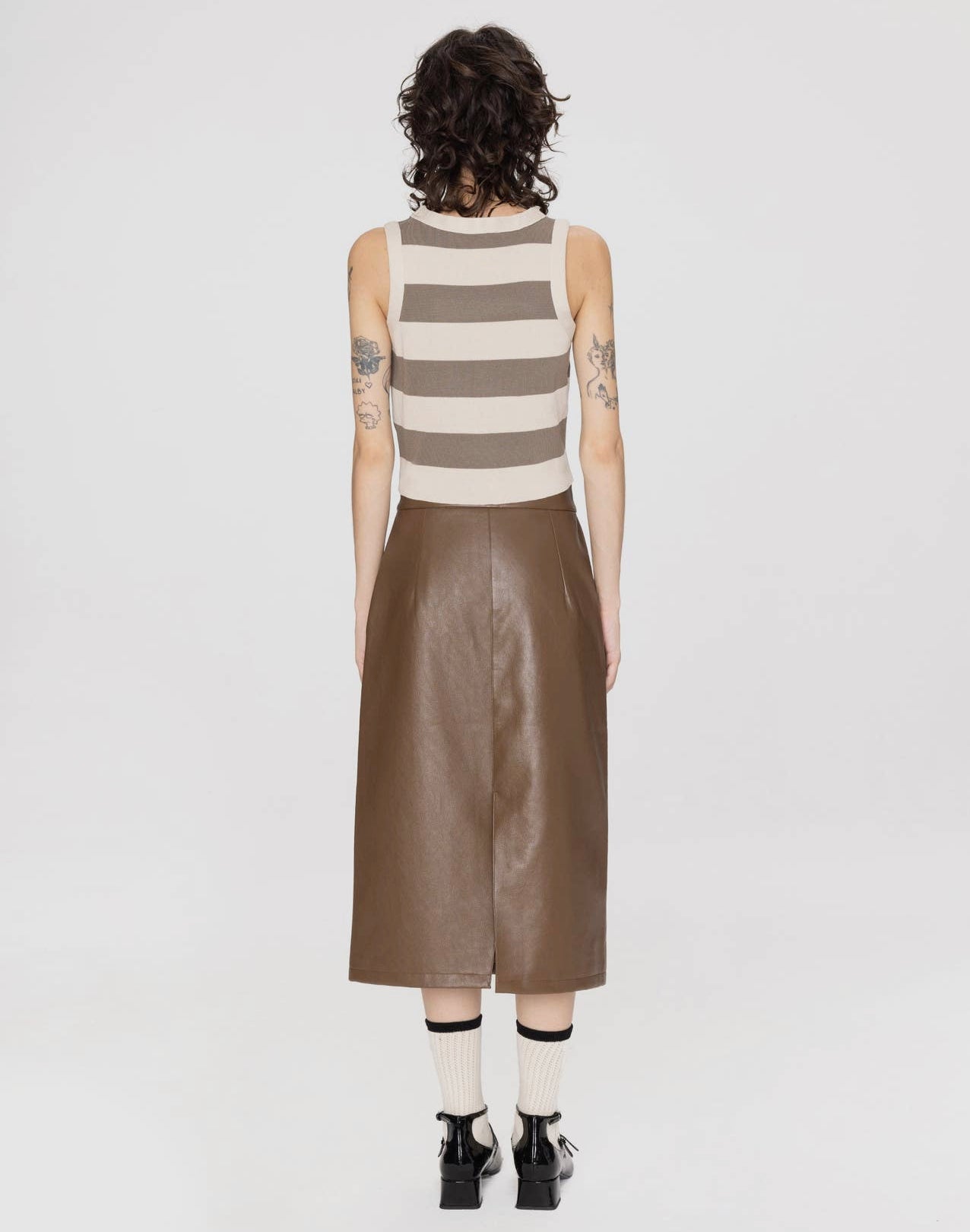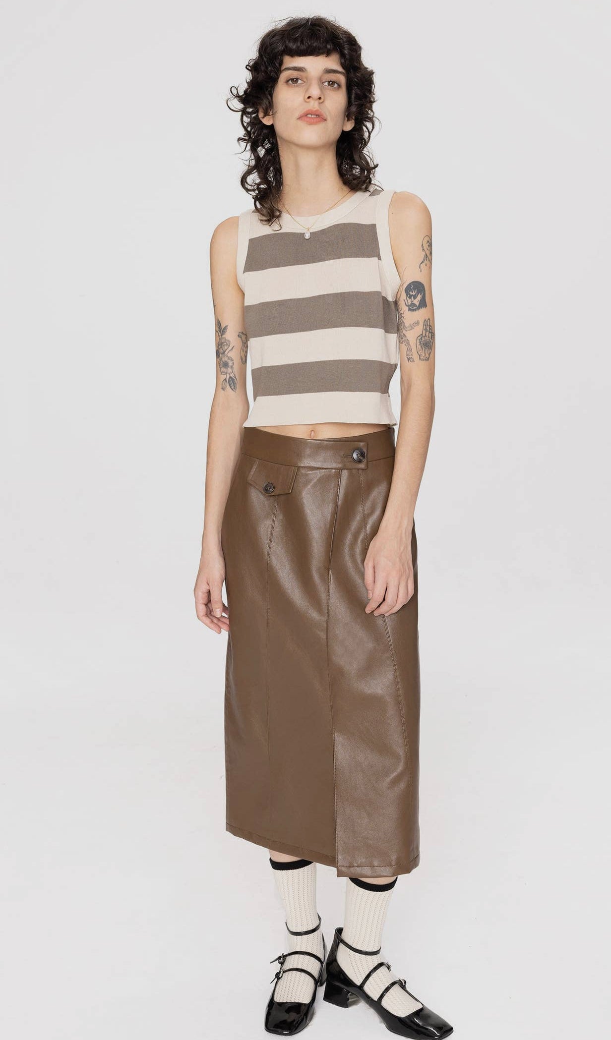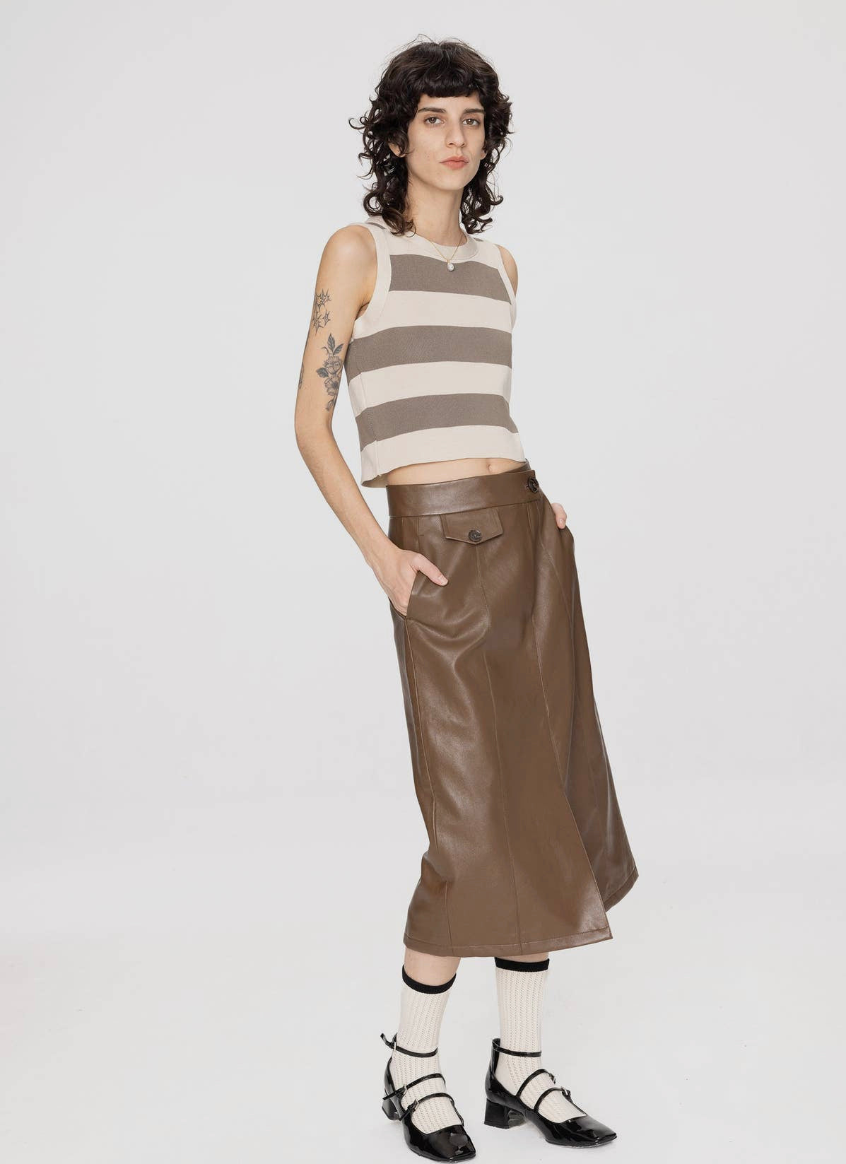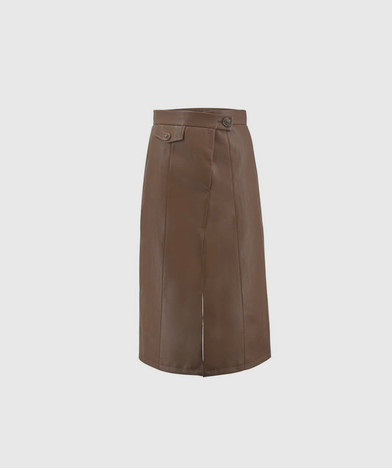 - PU skirt - A-line - High waisted - Back slit - Panelled - Front overlapping layer - Asymmetric button fastening - Buttoned waistband flap - Slanted pockets - Fabric: 50% Polyester, 45% Polyurethane, 5% Viscose - Lining: 100% Polyester - Model wears size S, which is US size 4
