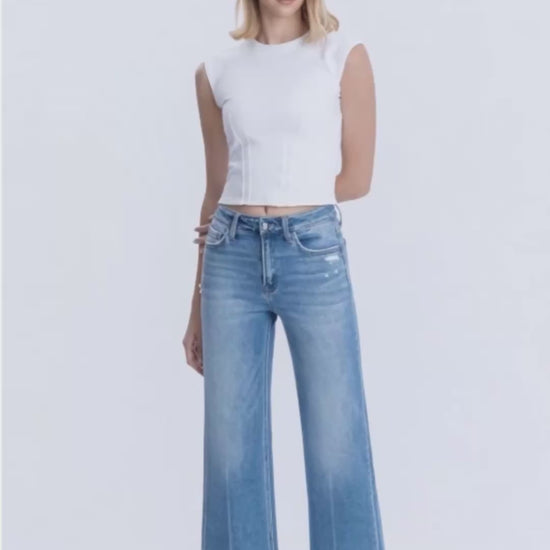 These high-rise cropped jeans feature a flattering slim wide-leg silhouette with just the right amount of stretch for all-day comfort. Designed in a classic medium wash with subtle distressing and a raw hem finish, they’re the perfect balance of modern and timeless. Easy to dress up with a blazer or down with a cozy knit.