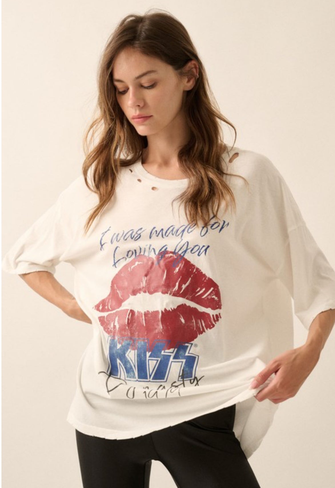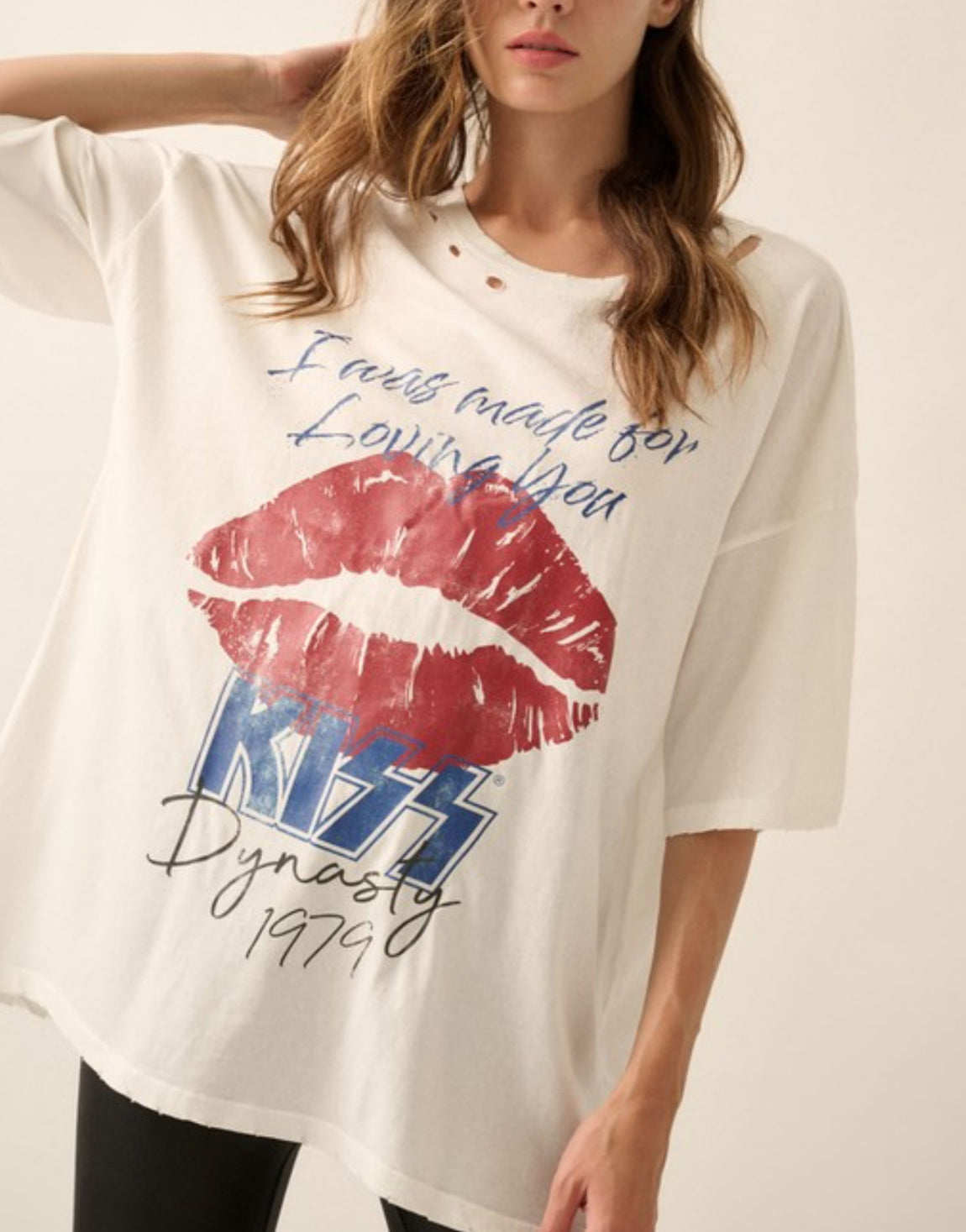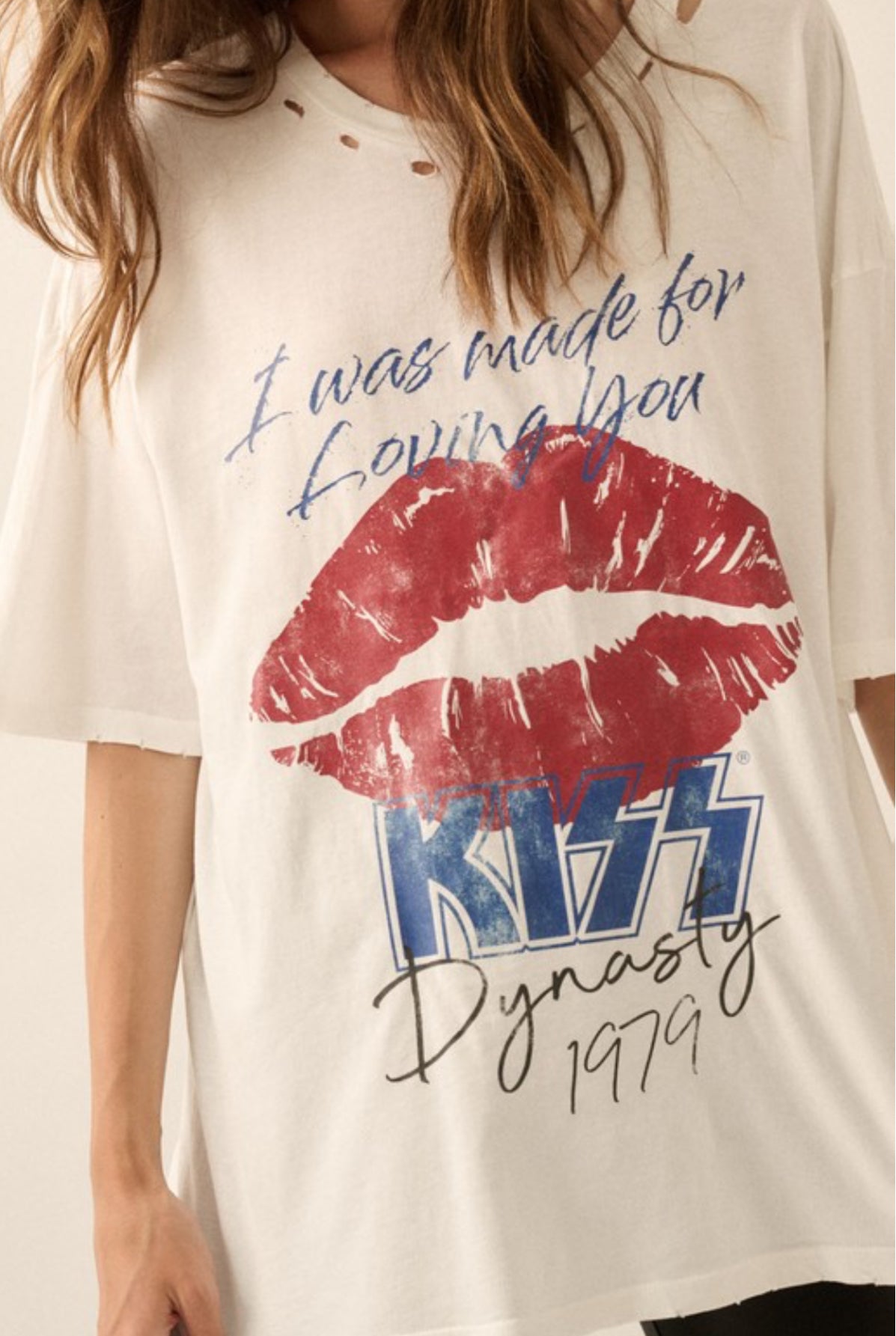 Vintage-style KISS logo print with lips graphic and text that reads, “I was made for loving you” and “Dynasty 1979”.