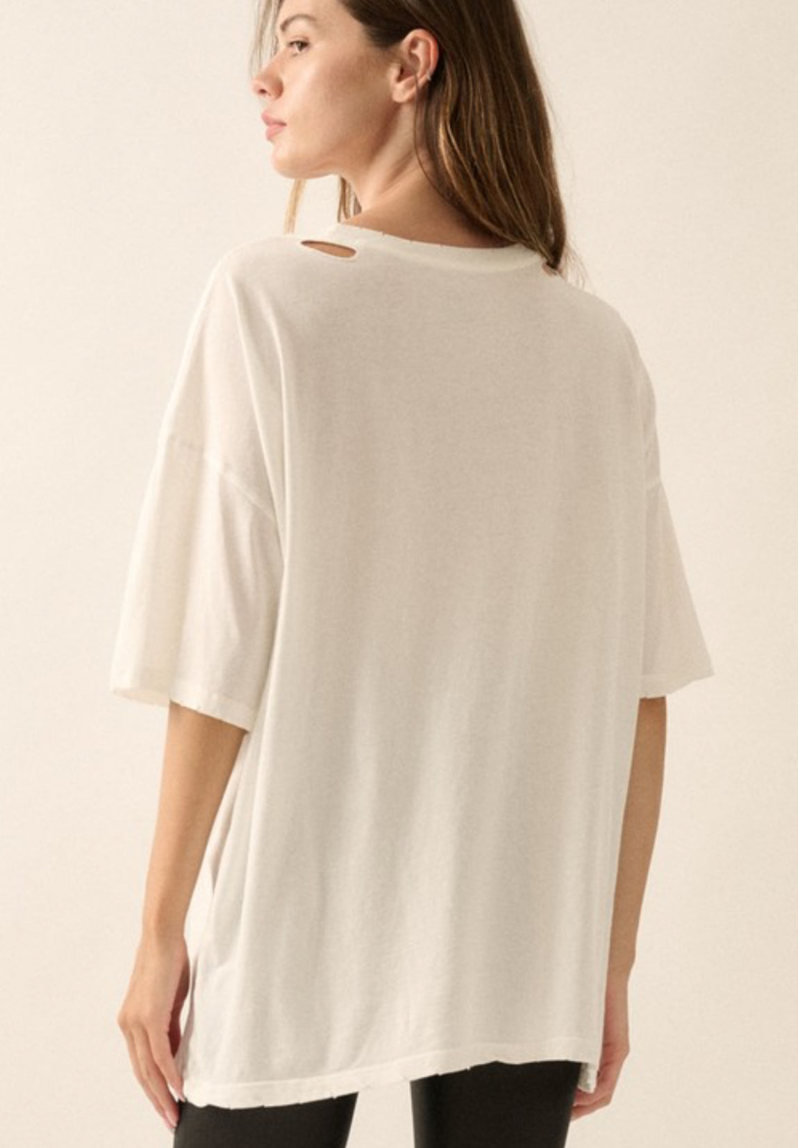 A soft distressed, garment washed graphic t-shirt with the following features: