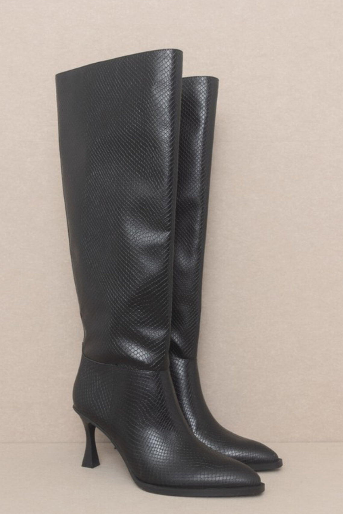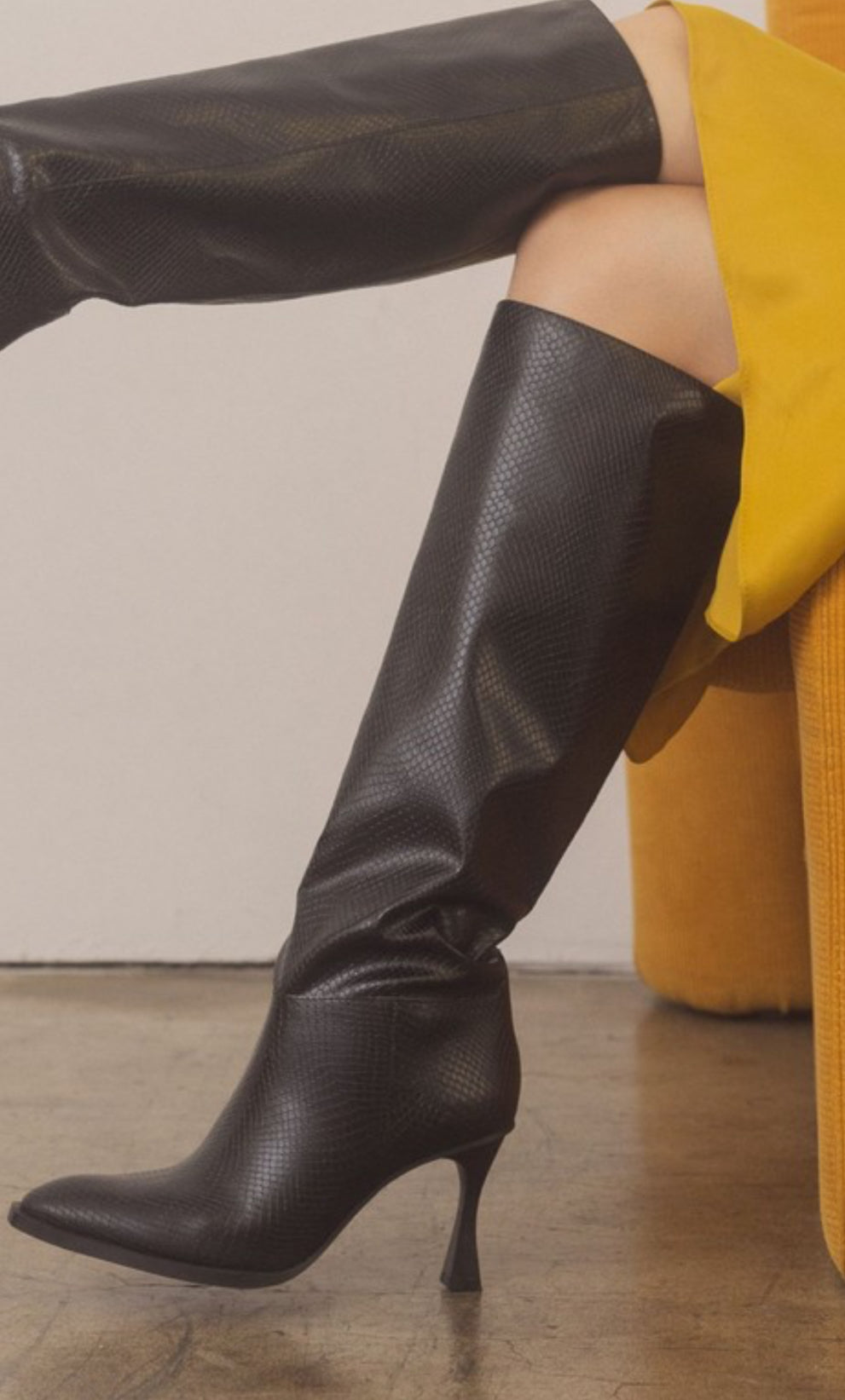 Stand out in a crowd in these knee high reptile print boots. Balanced on a dainty pyramid heel, these are turning heads everywhere you go.