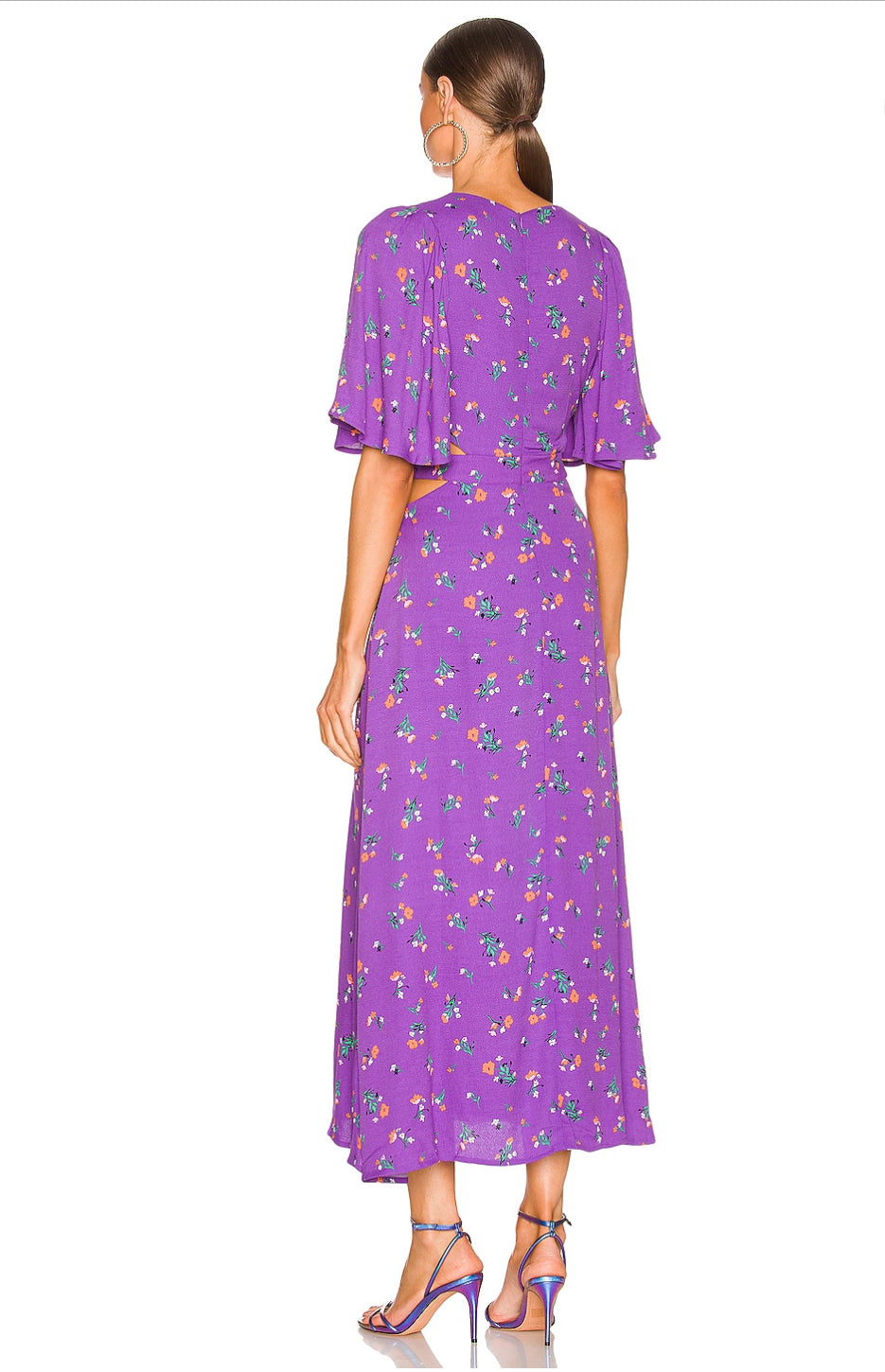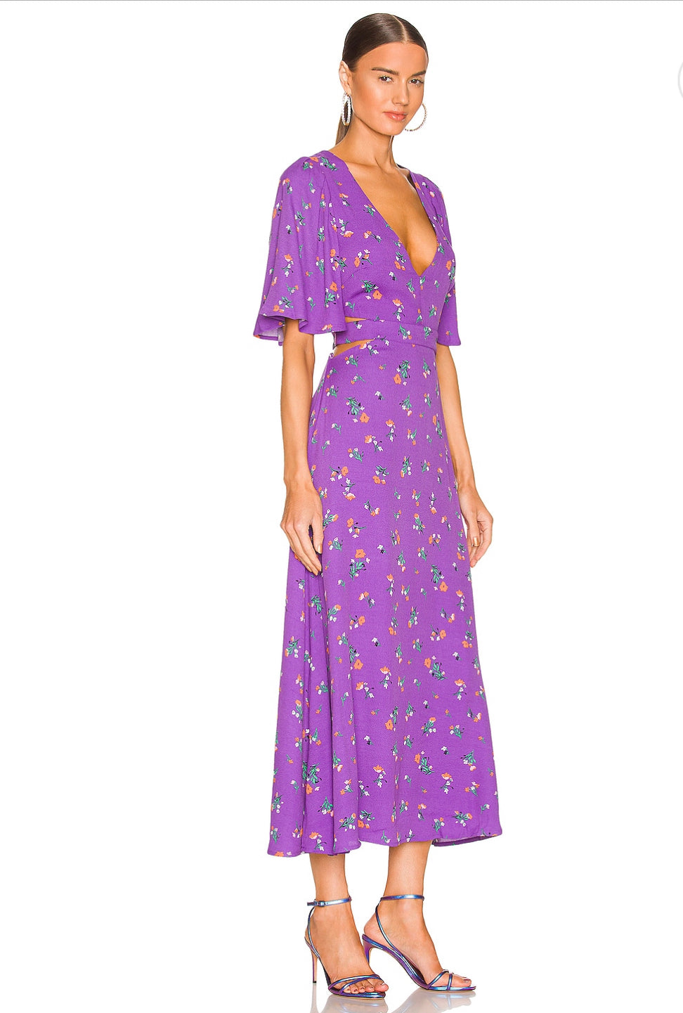The most gorgeous cut in a vibrant purple with subtle Aline shape and flutter sleeves with cut outs at the ribs along natural waist.