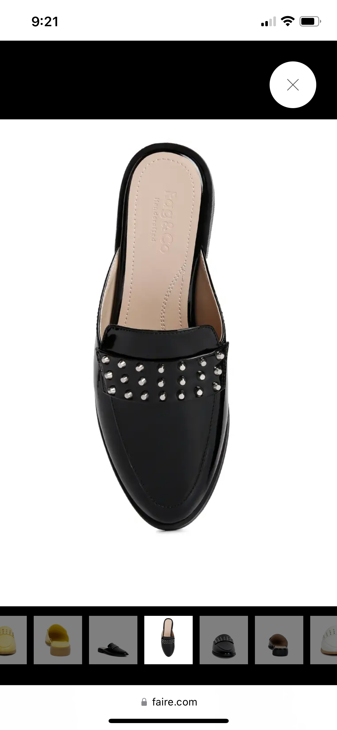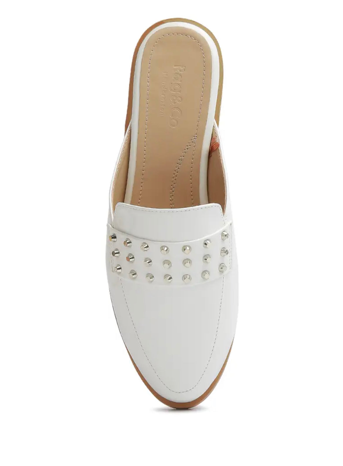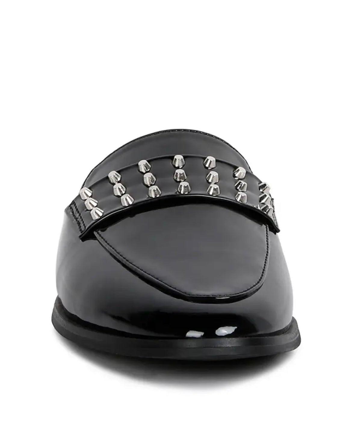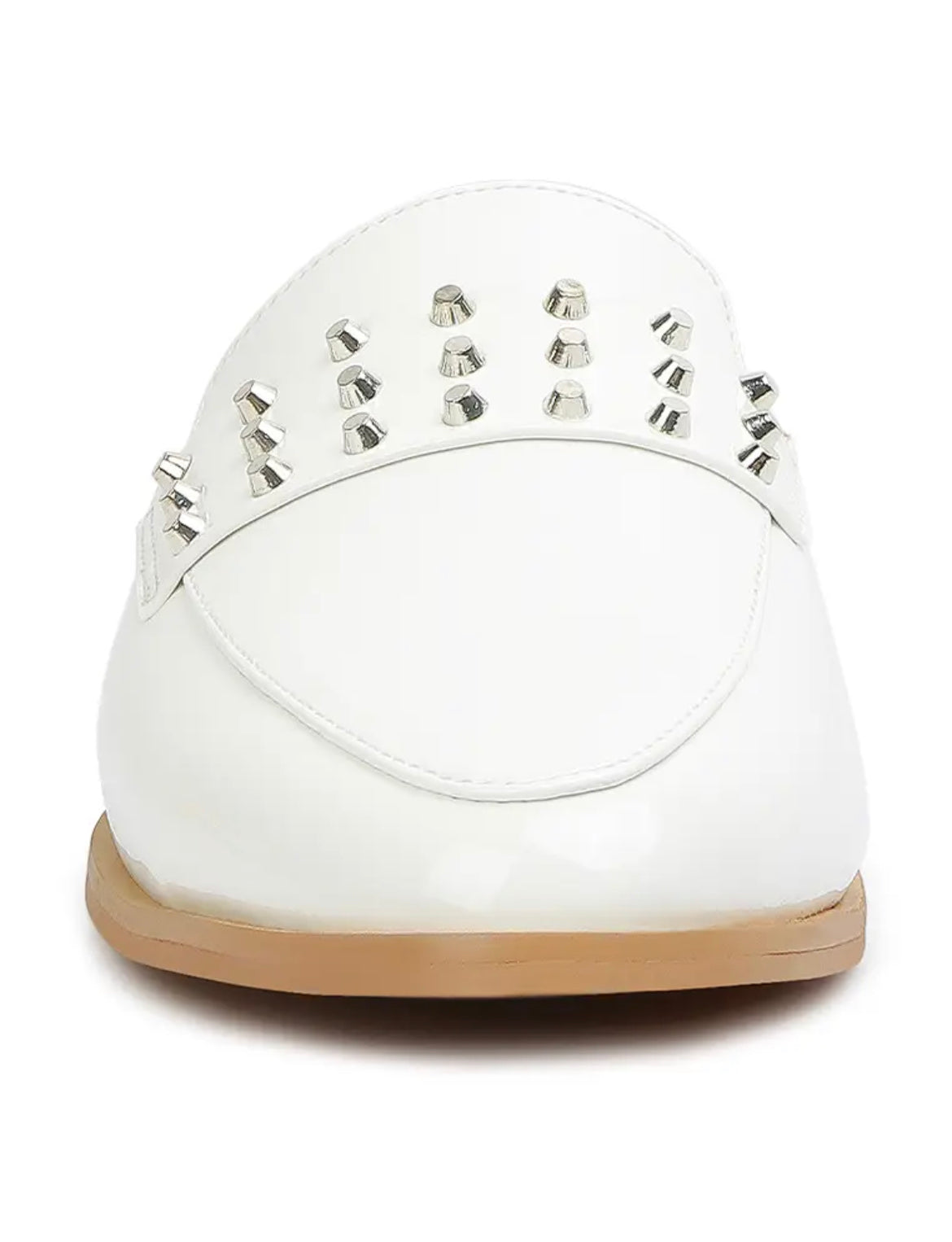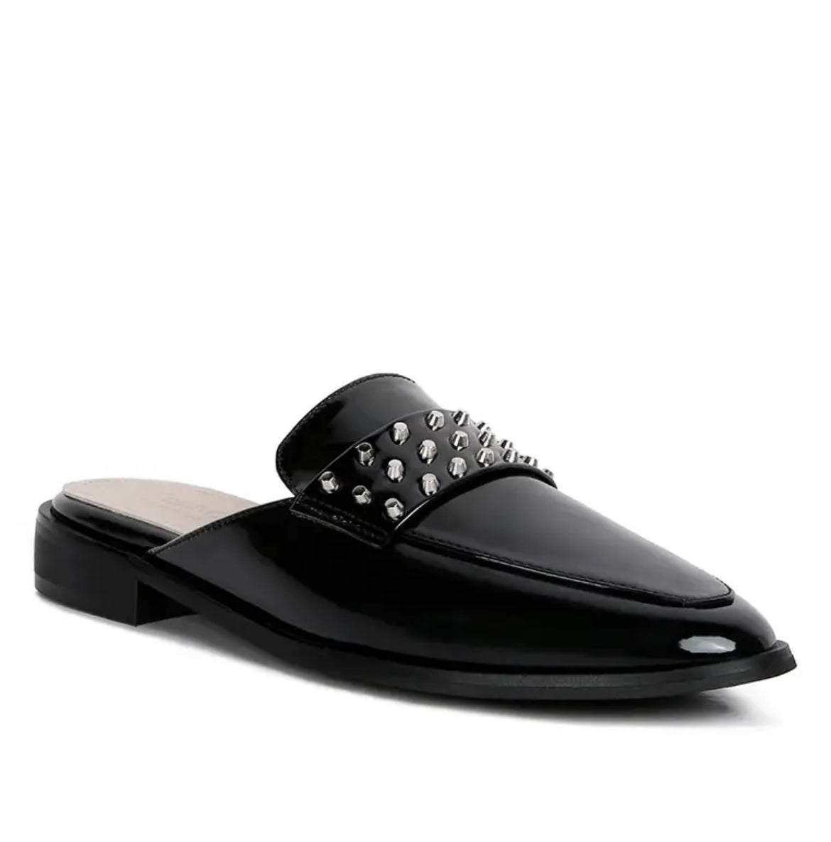 The perfect casual mules for women, with a lightly padded insole which gives ample support. The metal studded detail adds detail to the shiny patent almond toe flats. The low heel is a comfortable semi casual style for all day wear.